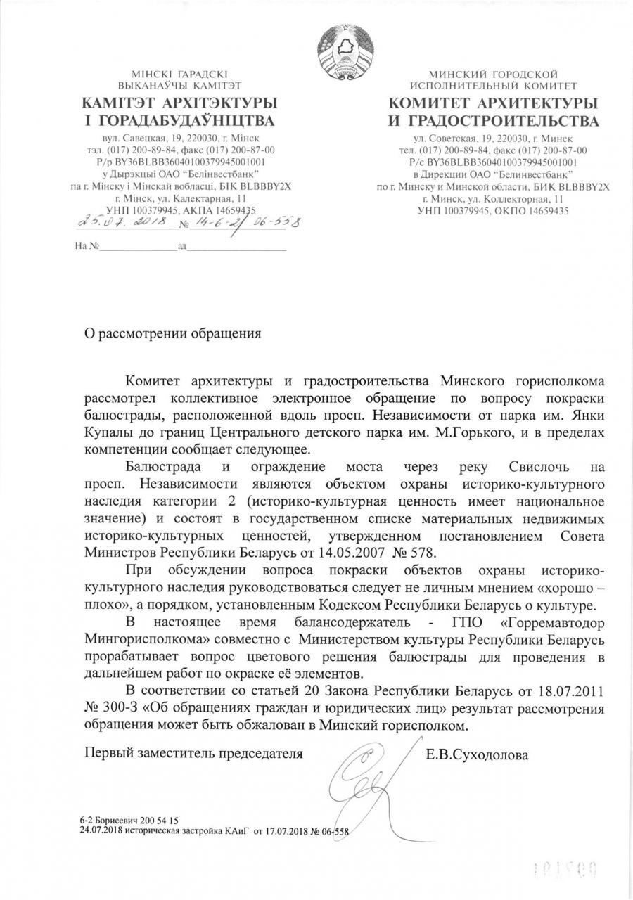 В настоящее время прорабатывается вопрос цветового решения балюстрады вдоль пр-та Независимости для проведения в дальнейшем работ по её окраске.