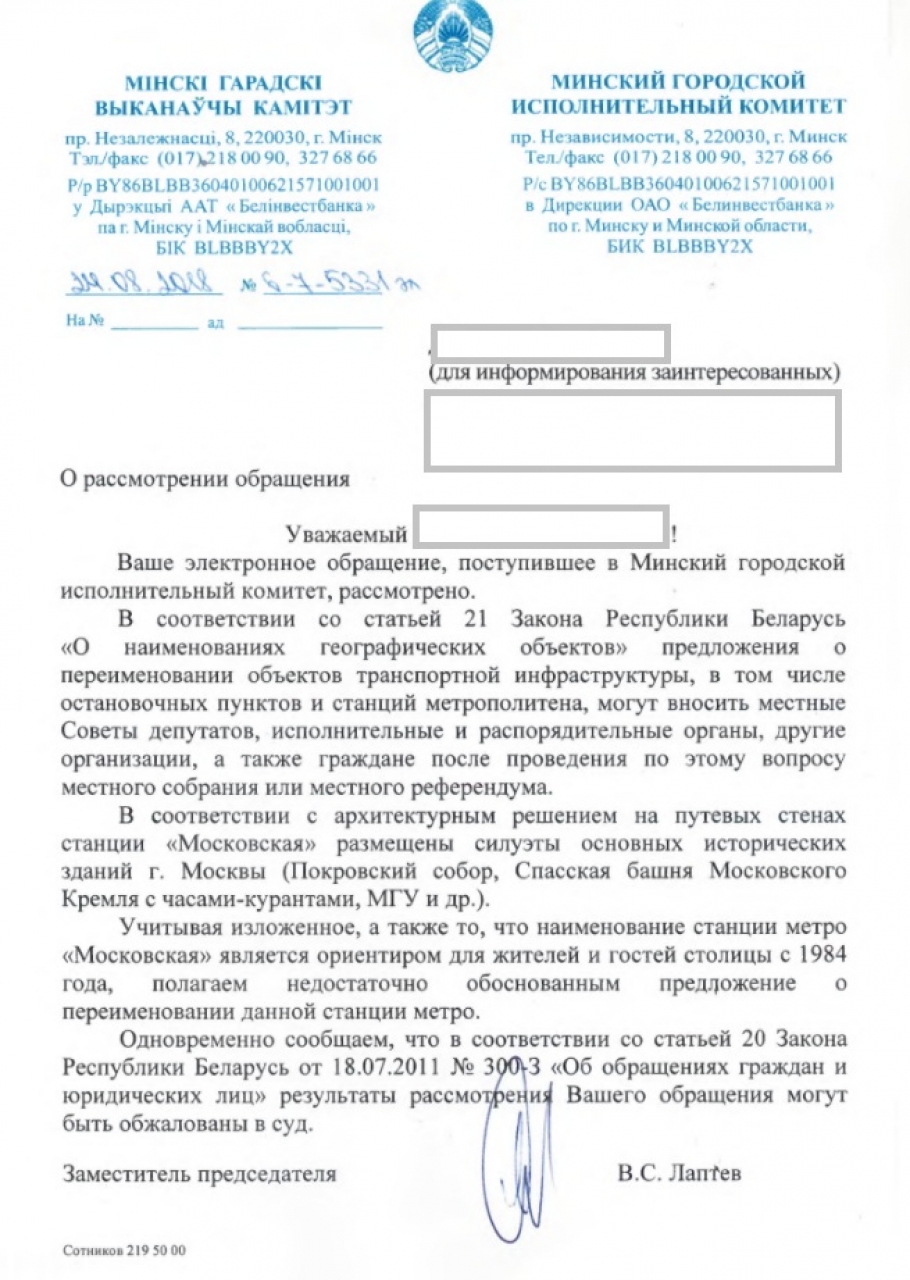 Одним из таких является станция метро "Московская". Очевидно, при её строительстве были какие-то причины дать такое название (автовокзал "Московский", который впрочем, находился за остановку от неё), но сейчас все они давно забыты. Более того, названия станции должны быть производными от близлежащих локаций. Но улица "Московская" находится в районе вокзала, а кинотеатр "Москва" - между станциями "Немига" и "Фрунзенская". Это уже не раз становилось источником анекдотов.