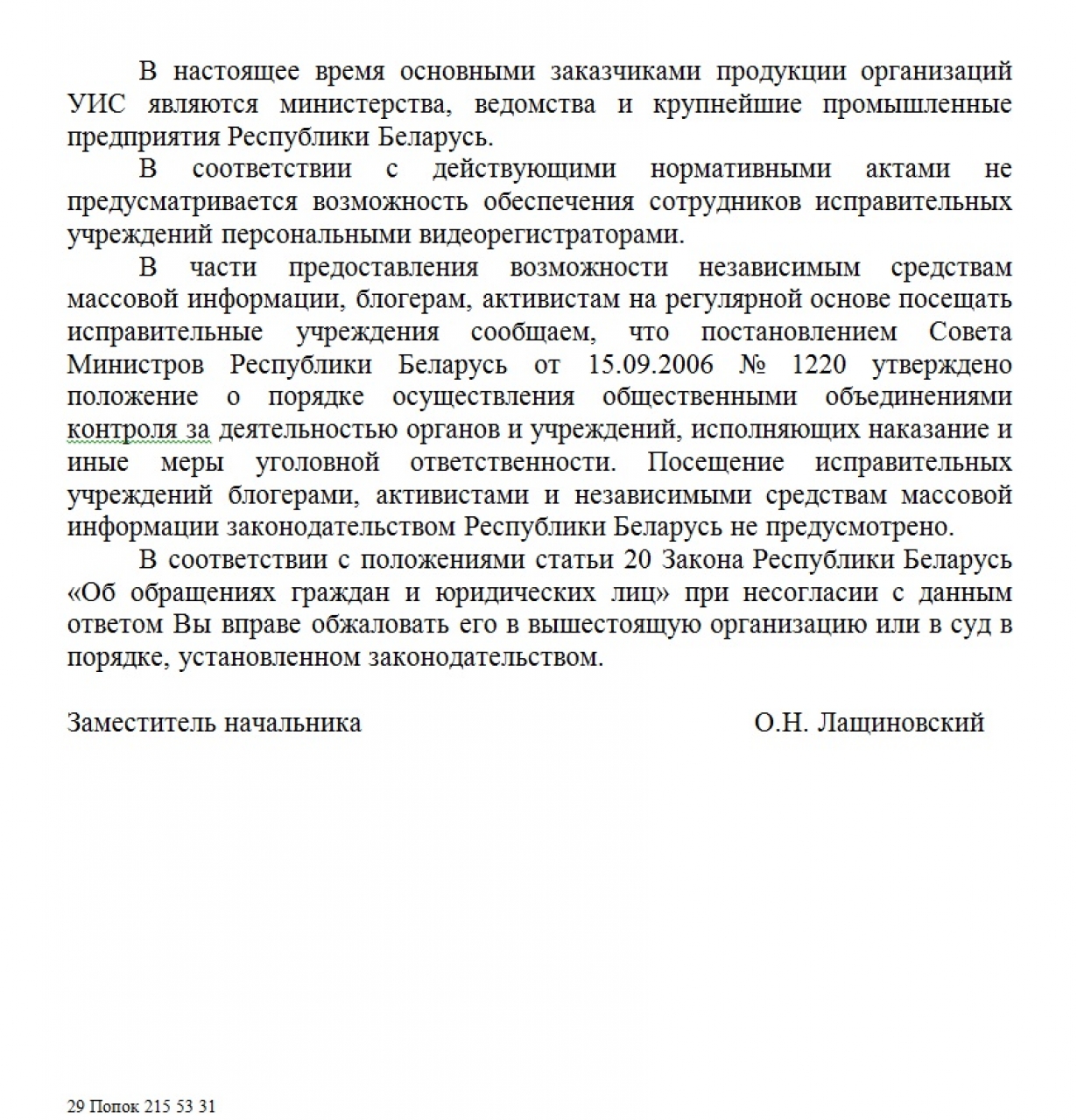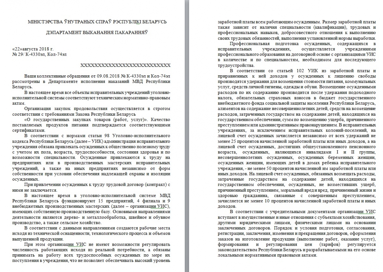 Мы нижеподписавшиеся располагаем информацией, что в местах лишения свободы, в исправительных учреждениях нарушены нормы пребывания, жестокое обращение с заключенными и исправительные учреждения напоминают больше концлагеря. Антисанитария, которая ведет к различным заболеваниям. Это нарушает Конституцию нашей страны и все права человека, которые указаны в конвенции по правам человека, которую Республика Беларусь подписала. С этим надо что-то делать. Страна победившая фашизм не может иметь на своей территории концлагеря, в наше мирное время. То, что произошло в нашей стране по статье 328 это ужасно и историки напишут обязательно о геноциде нации в это время.