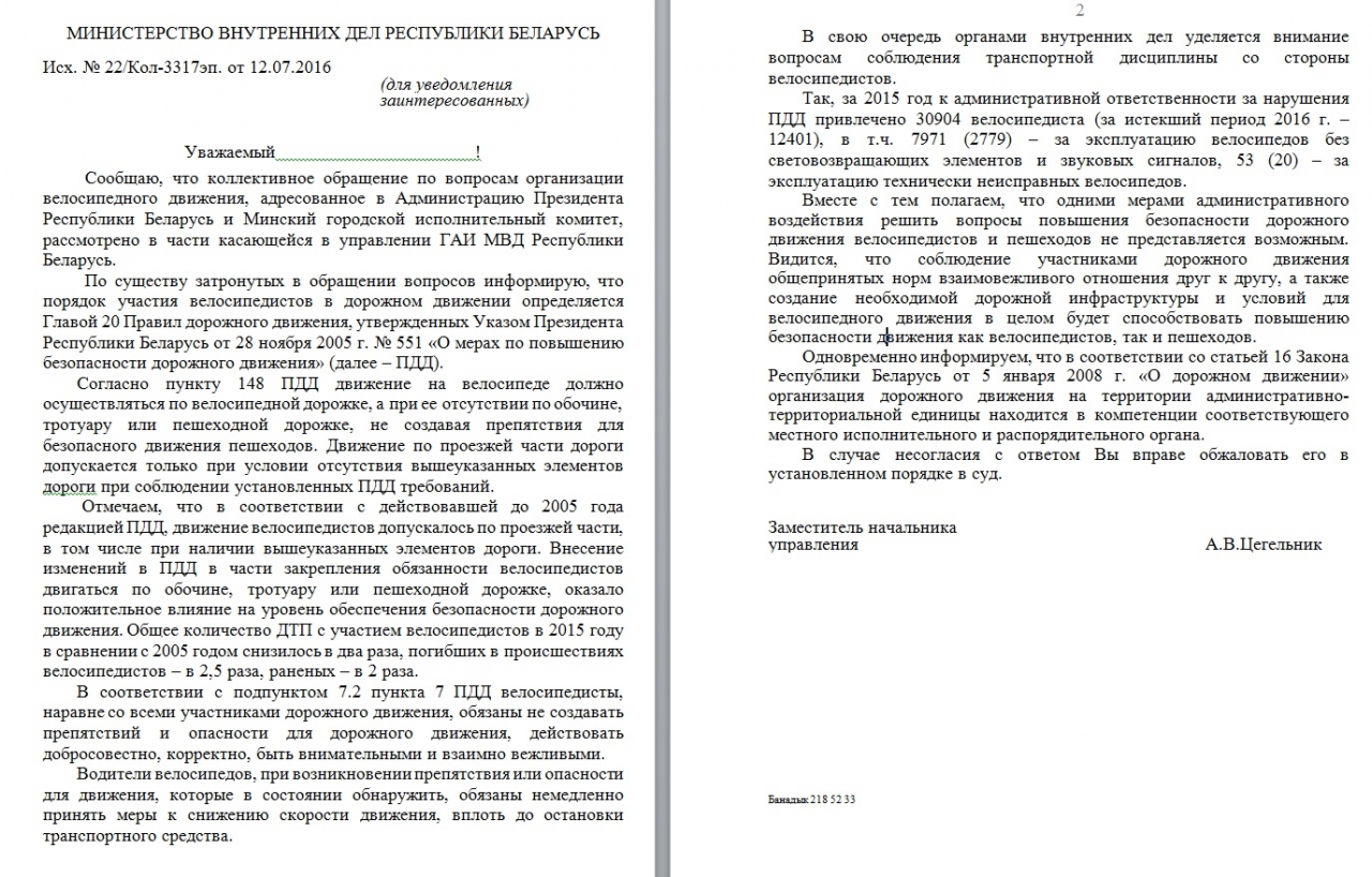 Органами внутренних дел уделяется внимание вопросам соблюдения транспортной дисциплины со стороны велосипедистов. Велосипедисты, наравне со всеми участниками дорожного движения, обязаны не создавать препятствий и опасности для дорожного движения, действовать добросовестно, корректно, быть внимательными и взаимно вежливыми. Соблюдение и велосипедистами, и пешеходами общепринятых норм взаимовежливого отношения друг к другу, а также создание необходимой дорожной инфраструктуры и условий для велосипедного движения в целом будет способствовать повышению безопасности движения.