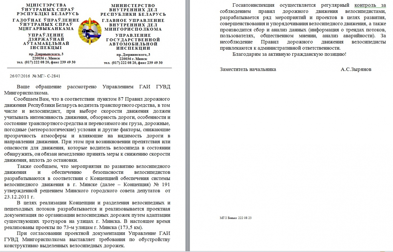 Во избежание этого просим обеспечить контроль милиции за безопасным передвижением велосипедистов по тротуарам.