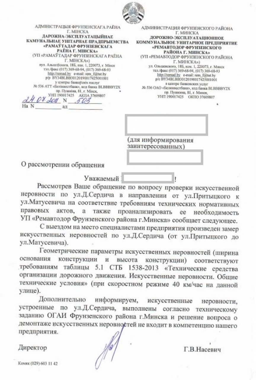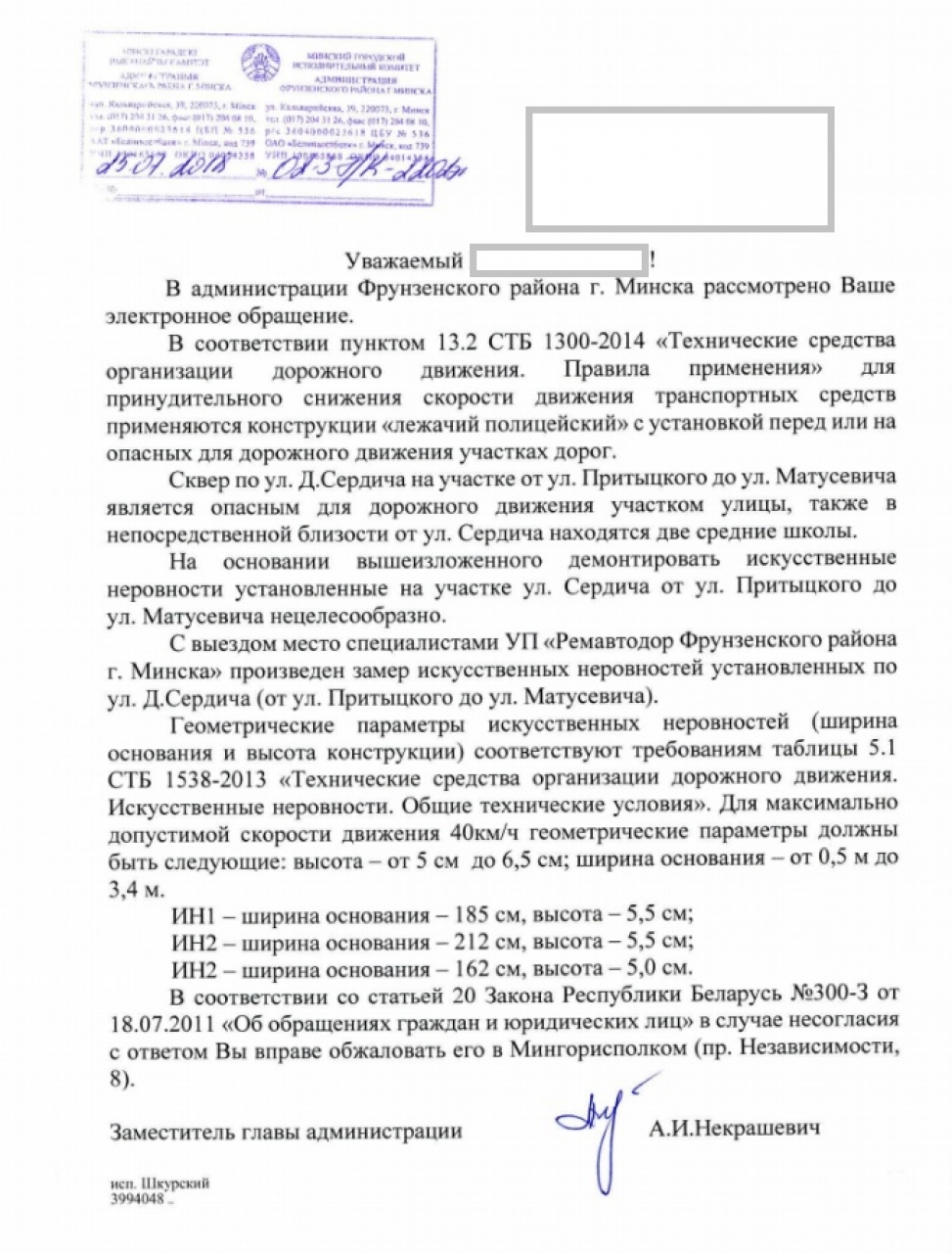 Параметры искусственной неровности соответствуют требованиям СТБ. Демонтировать ее нецелесообразно, так как рядом находятся две школы.