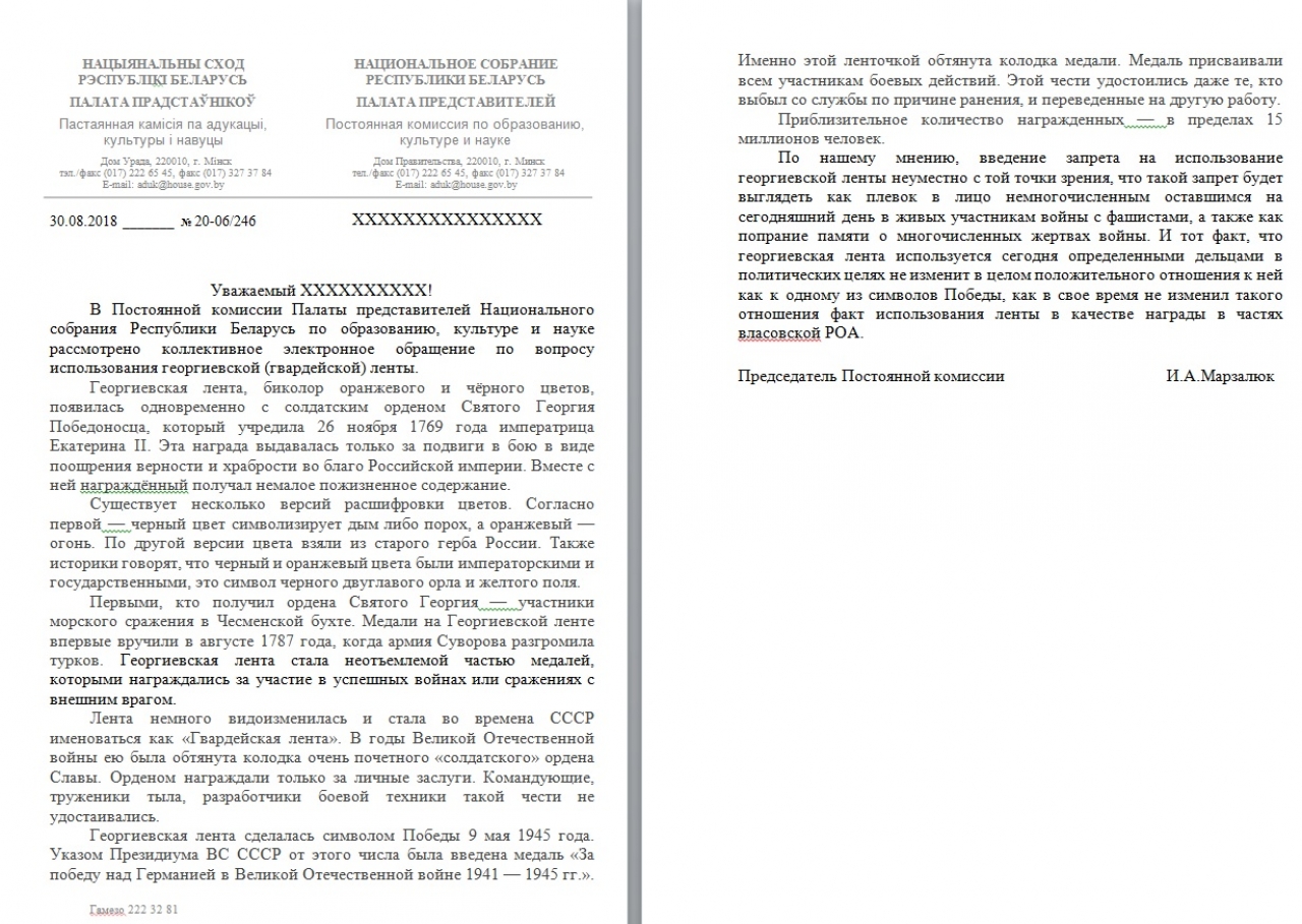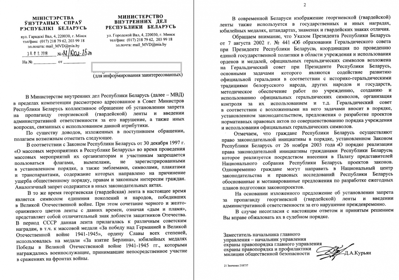 В связи с непризнанным международным сообществом включением в состав Российской Федерации в начале 2014 года части территории Крымского полуострова, расположенной в пределах административных границ регионов Украины — Автономной Республики Крым и города Севастополя, а также использованием георгиевской (гвардейской) ленты как символа вражеских сил на Донбассе (территория Украины) во время захвата власти, с применением огнестрельного оружия и военной техники, а также ставшей в настоящее время символом беззакония, хаоса, нестабильности и сотен жертв сепаратизма и пропаганды ленты в культурных, социальных и политических целях, по нашему мнению, её активное использование на территории Республики Беларусь представляет опасность для территориальной целостности Республики Беларусь.