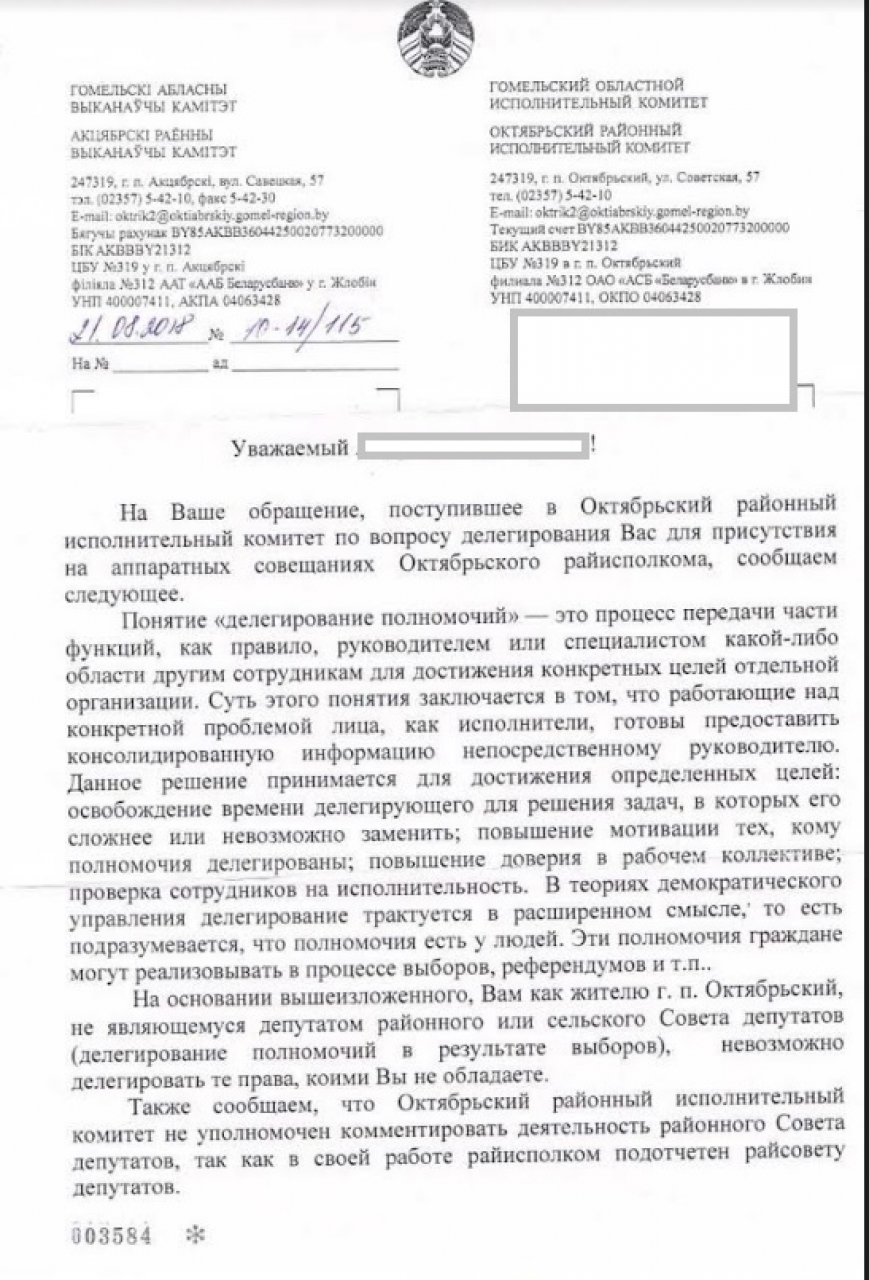 Мы, нижеподписавшиеся граждане Республики Беларусь, делегируем Паука Андрея Владимировича для присутствия на аппаратных совещаниях райисполкома г.п.Октябрьский Гомельской области, а также для присутствия на районных сессиях депутатов.