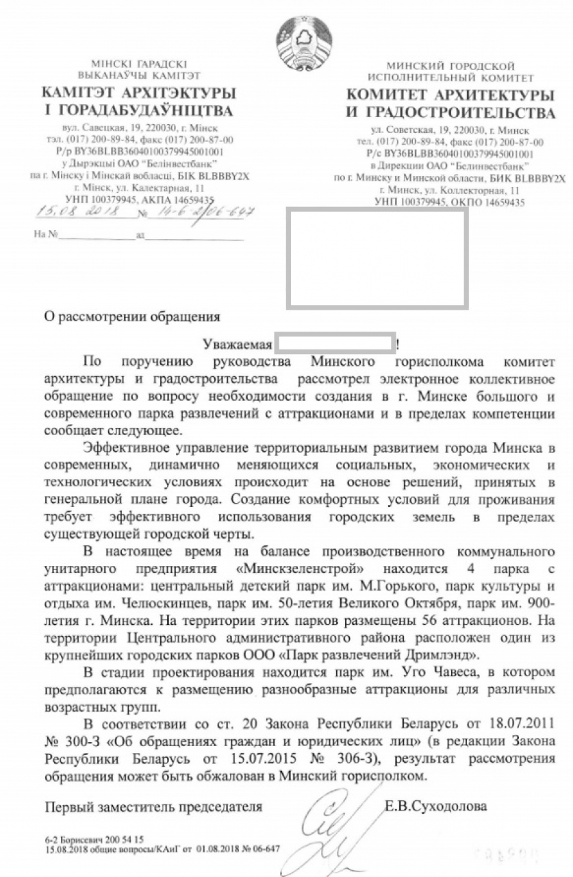 принять меры по созданию в пределах Минска парка отдыха, обладающего большой территорией и оборудованного современными аттракционами для различных возрастных групп посетителей.