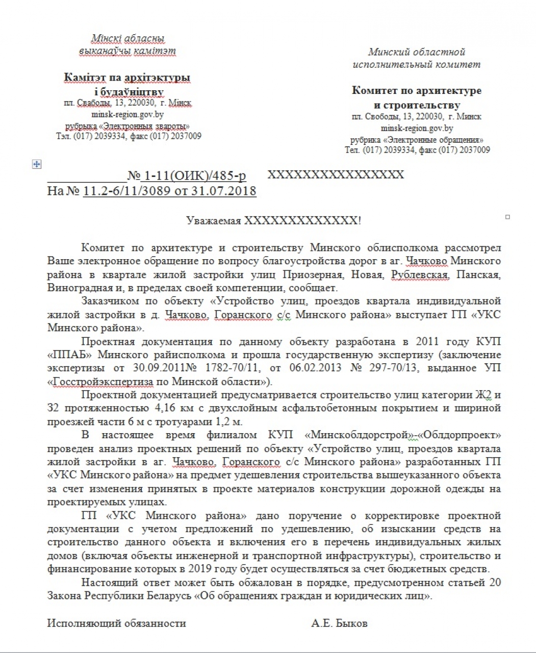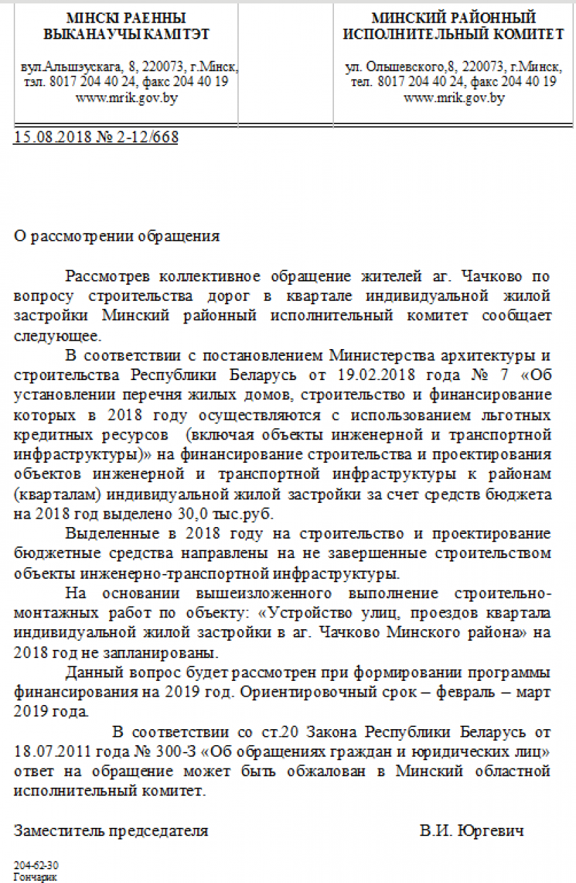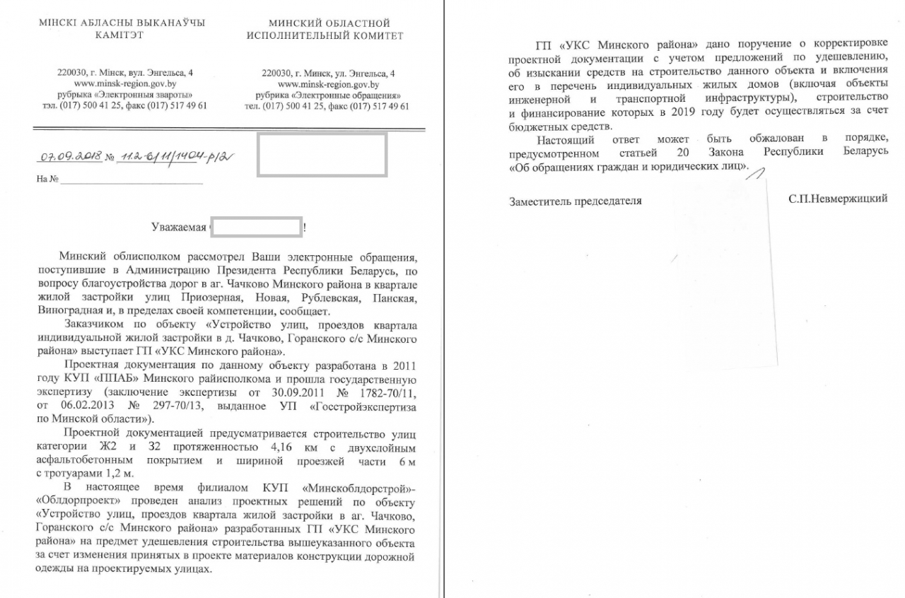 Жителями и застройщиками района на протяжении 2010-2018 гг неоднократно направлялись соответствующие обращения, в т.ч. и коллективные, в местные исполнительные и распорядительные органы. Также неоднократно организовывались выезды на место представителей исполнительных органов. Последний комиссионный выезд состоялся 05.01.2018 с участием представителей комитета по архитектуре и строительству Миноблисполкома, отдела архитектуры и строительства Минрайисполкома, ГП «УКС Минского района». В ходе обследования был подтвержден факт отсутствия дорог, отсутствия благоустройства улично-дорожной сети, неудовлетворительное состояние проезжей части. Строительство данных объектов не выполнялось по причине отсутствия финансирования.