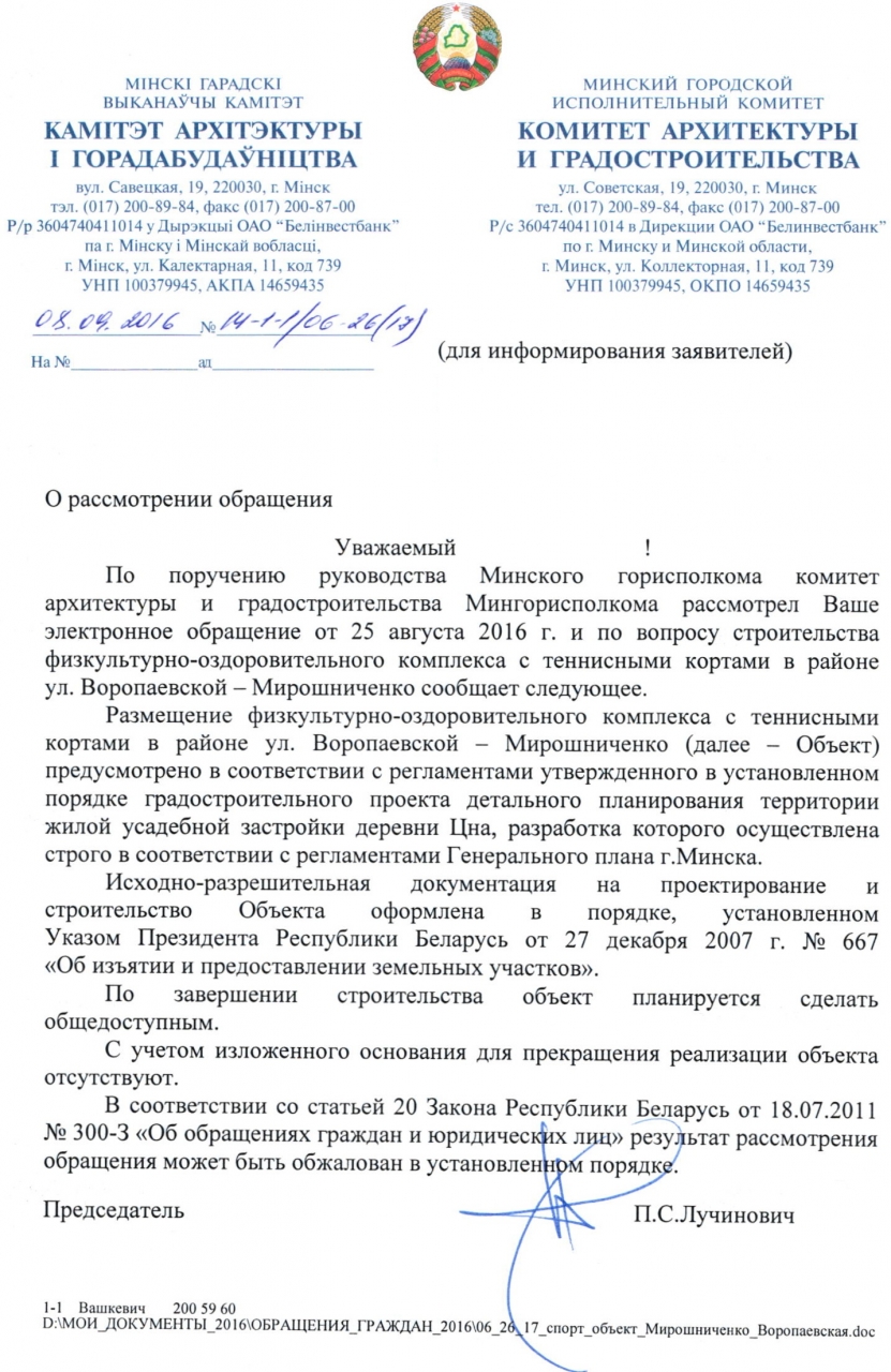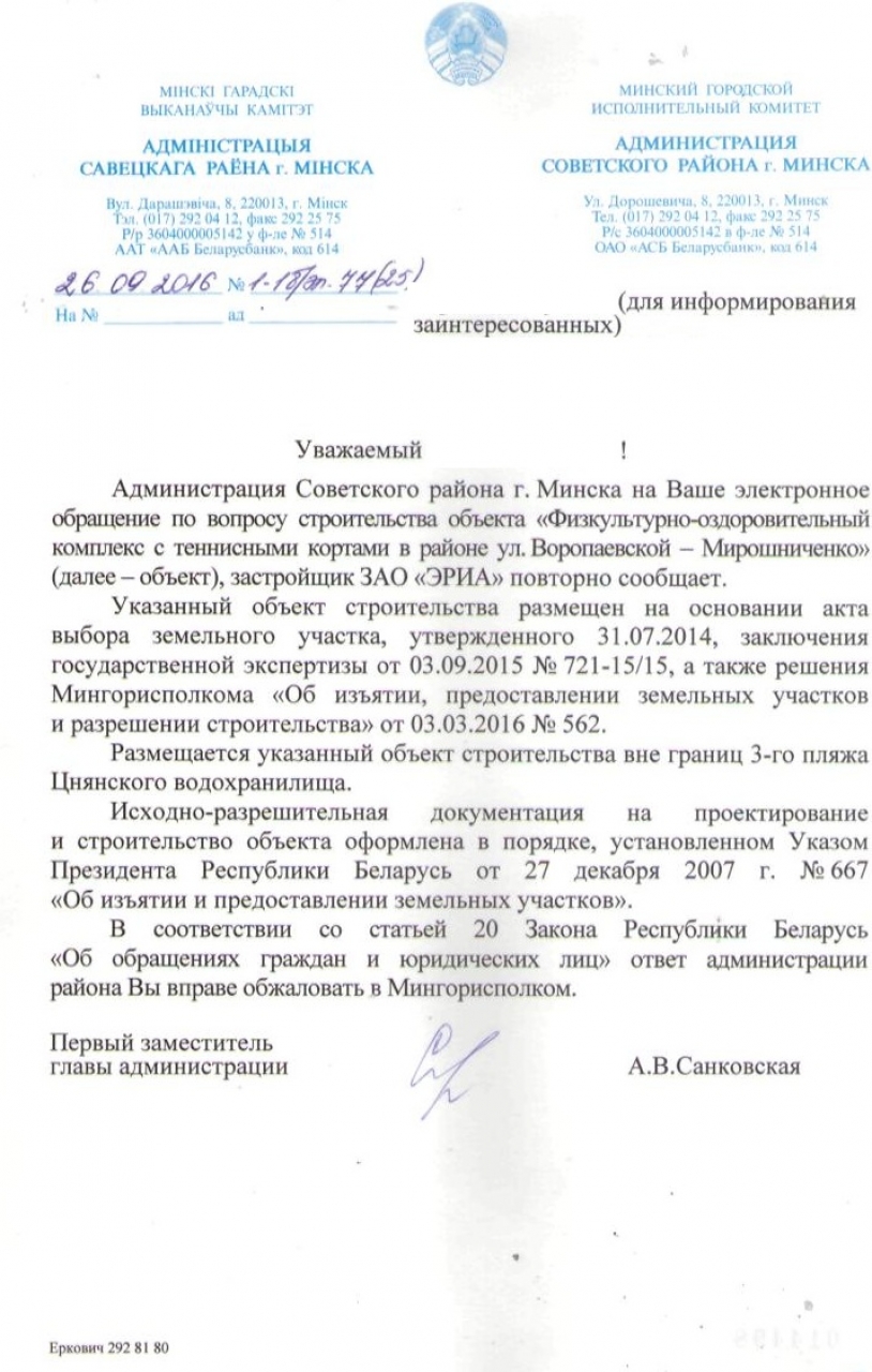 Размещение физкультурно-оздоровительного комплекса с теннисными кортами предусмотрена утвержденным Генеральным планом г.Минска. Объект планируется сделать общедоступным. Он размещается вне границ 3-го пляжа Цнянского водохранилища.