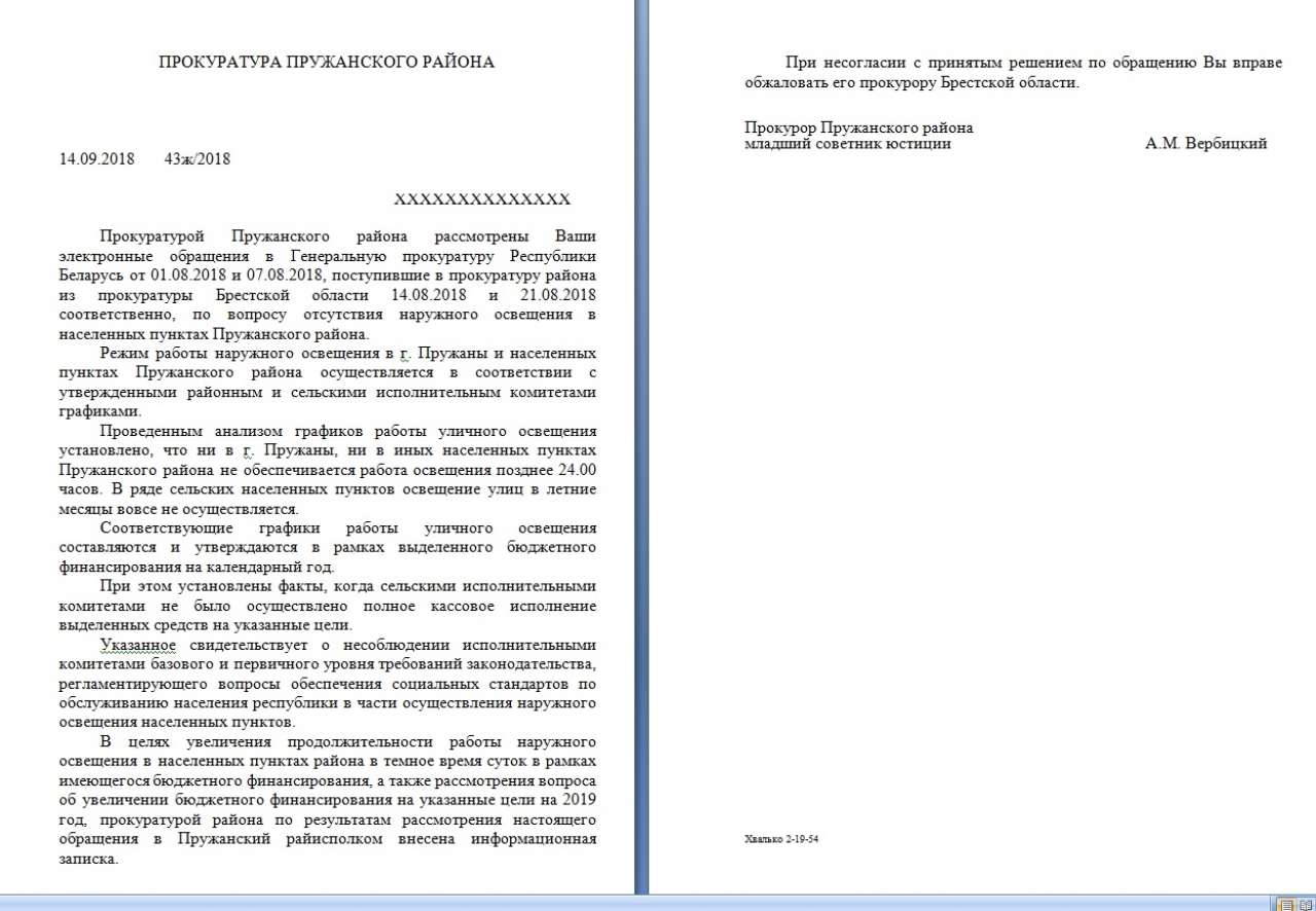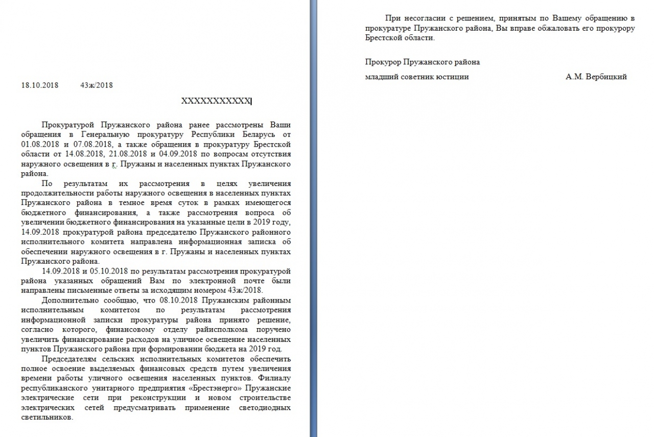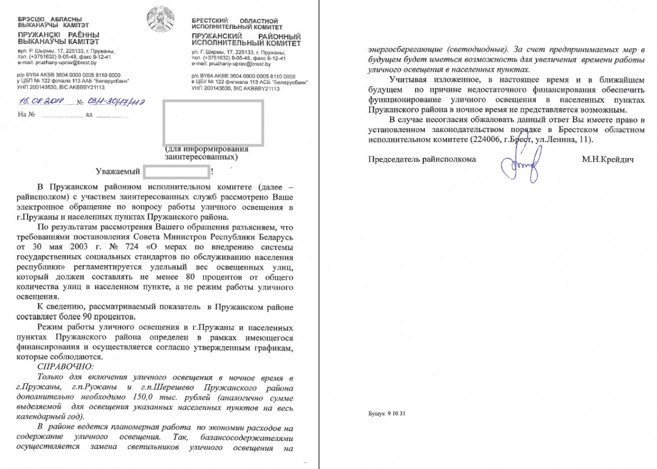 Выявлено несоблюдение исполнительными комитетами базового и первичного уровня требований законодательства, регламентирующего вопросы обеспечения социальных стандартов по обслуживанию населения республики в части осуществления наружного освещения населенных пунктов. В Пружанский райисполком внесена информационная записка.