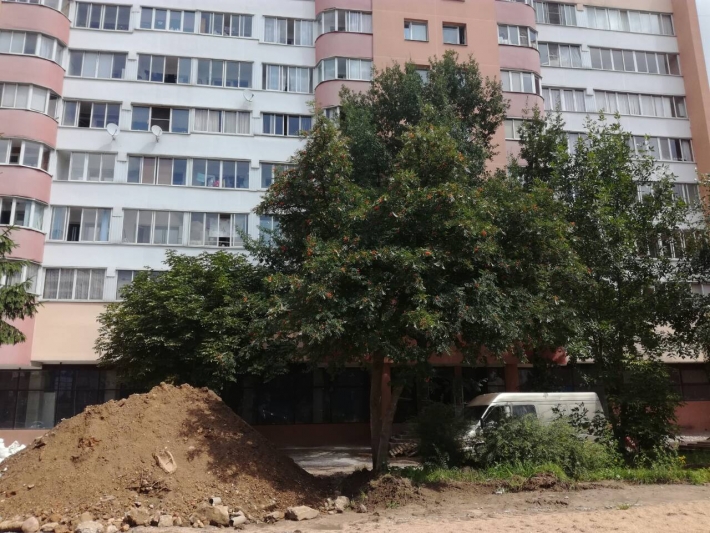 Перед окнами дома растут большие деревья: ели, красная рябина, каштаны, кустарники, дуб, 14 деревьев! 616 кв.метров газона...это все будут вырубать ради парковки!