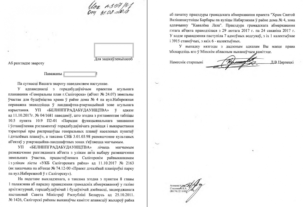 Мы, ніжэй падпісаныя жыхары горада Салігорска, выступаем супраць будоўлі праваслаўнага храма Святой Вялікамучаніцы Варвары ў раёне дома №4 па вуліцы Набярэжная ў г. Салігорску, які будзе знаходзіцца ў непасрэднай блізкасці да дзіцячага пляжа. Прычыны, з якіх мы выступаем супраць, наступныя: