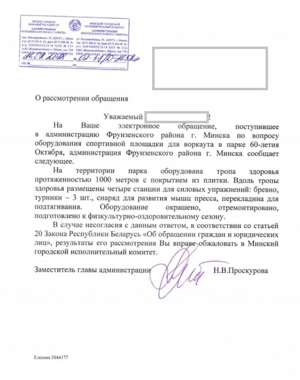 На основании ст. 41 Закона "О местном управлении и самоуправлении", относящей вопросы проведения физкультурно-оздоровительной и спортивно-массовой работы, поддержания достаточного уровня обеспеченности населенных пунктов физкультурно-спортивными сооружениями, просим организовать в данном парке современную площадку для воркаута.