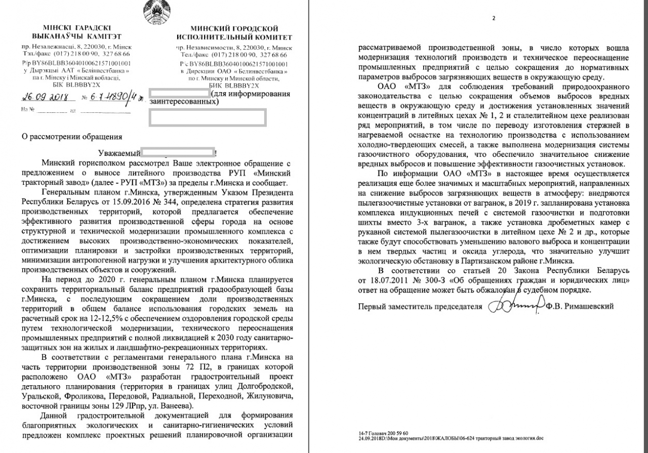 Таким образом, вынос за пределы г. Минска литейных цехов МТЗ и последующая реорганизация его территории послужит улучшению экологии и состояния окружающей среды в г. Минске, реализации права жителей Партизанского района на благоприятную среду проживания, более эффективному использованию земли в центре столицы Республики Беларусь.