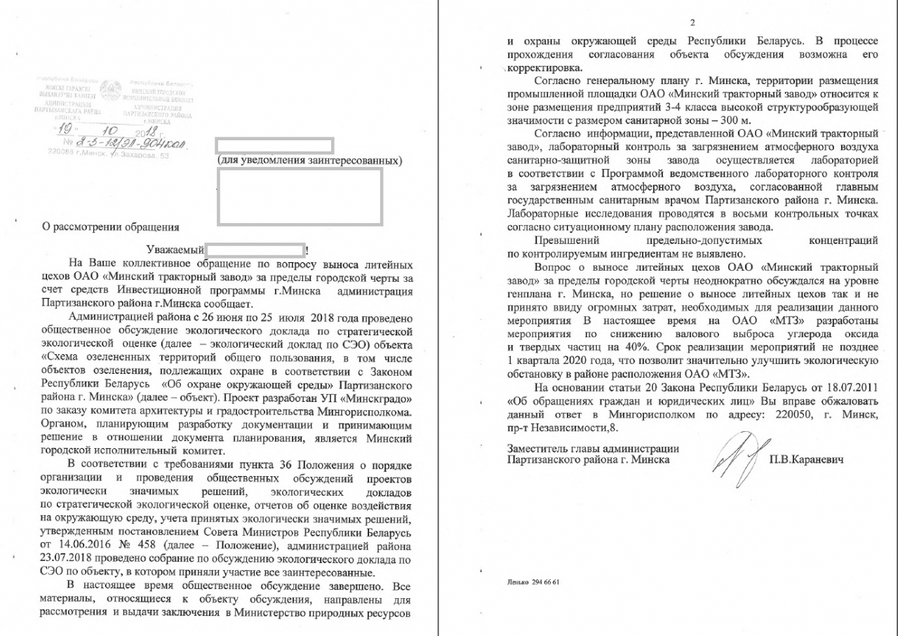 26 июня 2018 года на общественное обсуждение представлен экологический доклад по стратегической экологической оценке по объекту «Схема озелененных территорий общего пользования, в том числе объектов озеленения, подлежащих охране в соответствии с Законом Республики Беларусь «Об охране окружающей среды» Партизанского района г. Минска». В соответствии с документом, «основными стационарными источниками загрязнения атмосферного воздуха являются РУП «Минский тракторный завод» (далее МТЗ), филиалы РУП «Минскэнерго» (ТЭЦ–3, ТЭЦ–4), Минские тепловые сети (районные котельные), Минская очистная станция КУПП «Минскводоканал», ОАО «Минский автомобильный завод», ОАО «Минский завод отопительного оборудования», ОАО «Минский завод строительных материалов», ОАО «Керамин», ЗАО «Атлант», УП «Минсккомунтеплосеть», ОАО «Минский моторный завод». Распределение объемов выбросов загрязняющих веществ от стационарных источников по территории города неравномерно. Наибольшая эмиссия по-прежнему характерна для Заводского, Фрунзенского и Партизанского районов».