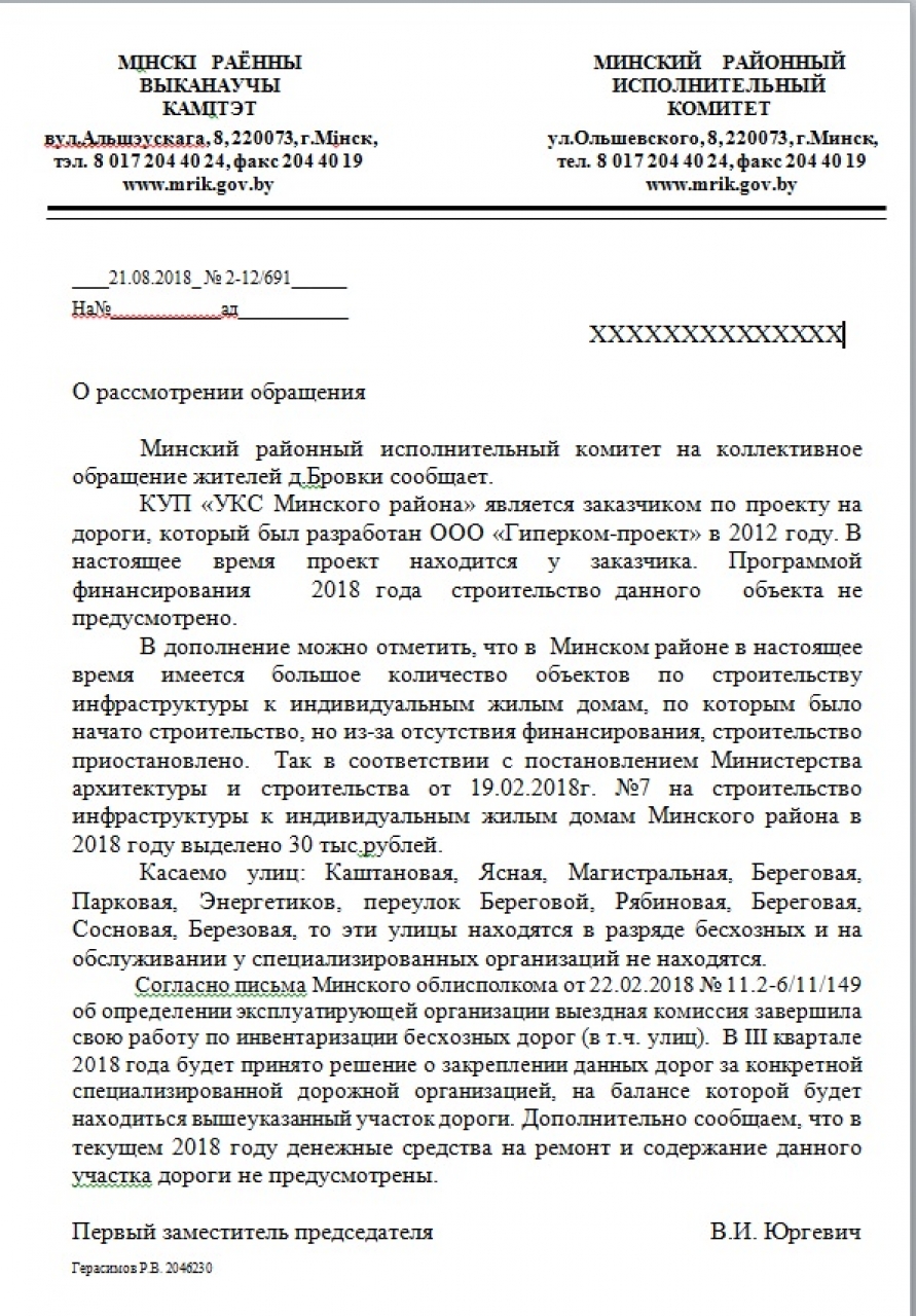 На основании ст. 41 Закона "О местном управлении и самоуправлении", относящей вопросы дорожного строительства к компетенции исполкомов, просим разобраться с данным вопросом и предоставить информацию о том, когда и кто будет строить и чинить дороги в деревне Бровки, с указанием конкретных сроков.