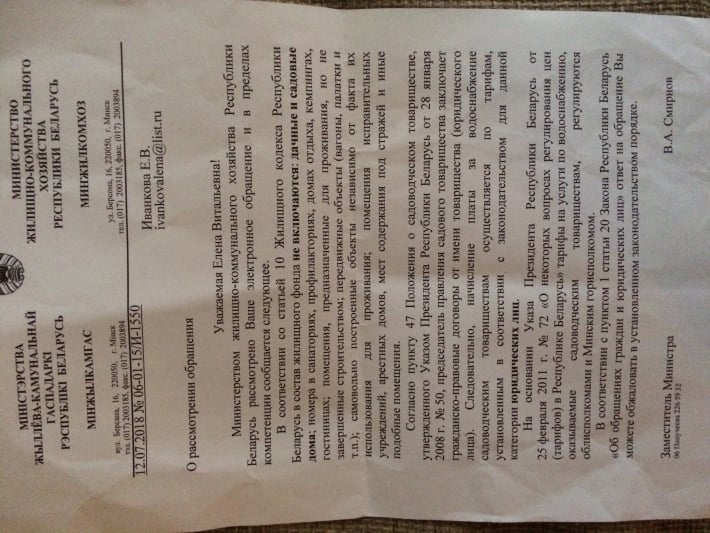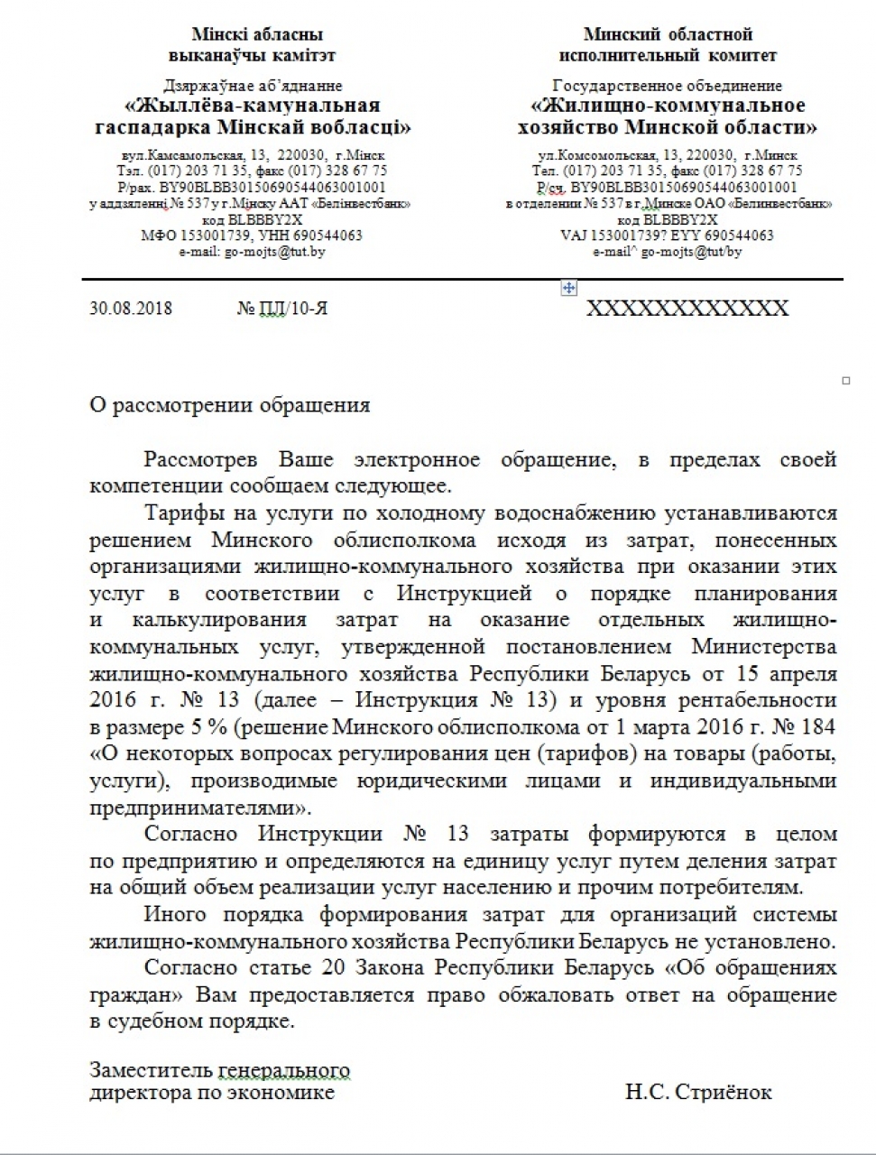 Просим объяснить процесс определения цены за услуги водоснабжения, оказываемые СТ "Авиатор". Ведь цена - это обоснованные затраты плюс прибыль, а не затраты всего Минского района на практически индивидуальную скважину.