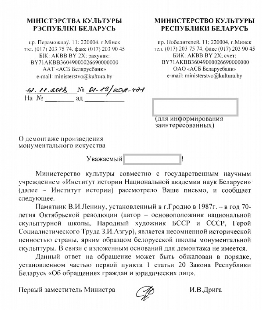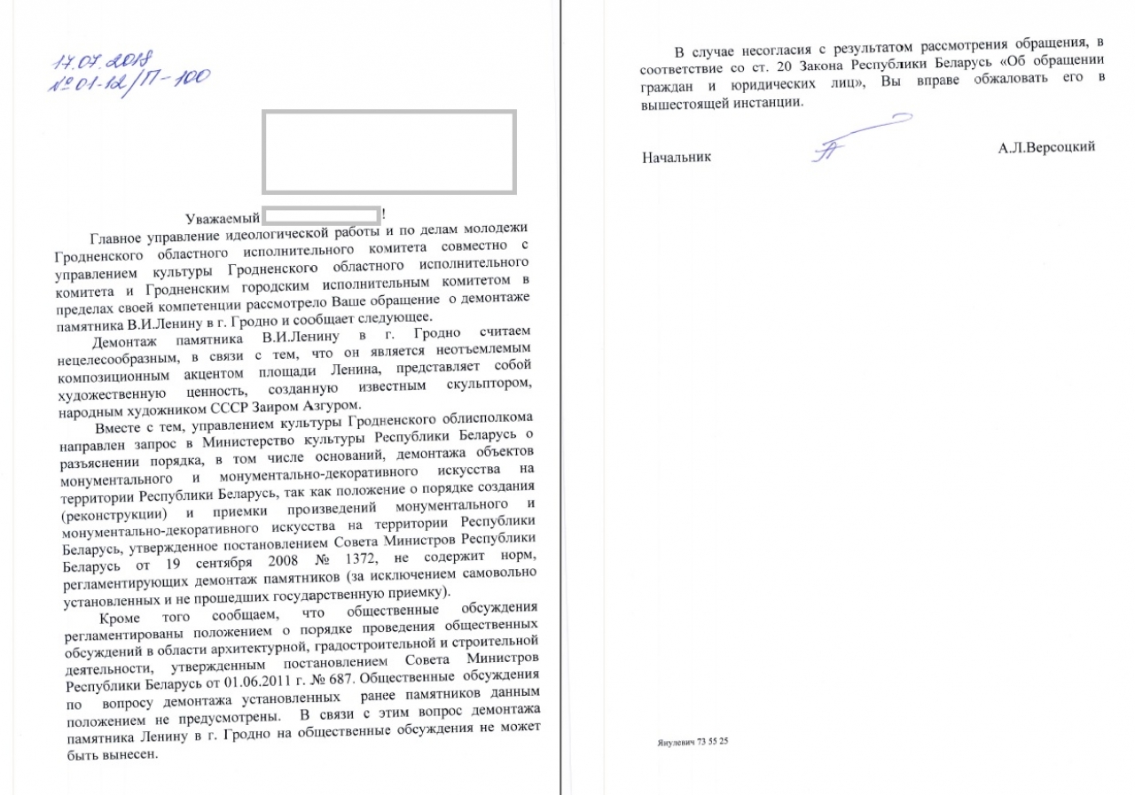 В современной Беларуси данная (коммунистическая) идеология более не актуальна, более того, Конституцией Республики Беларусь провозглашается плюрализм в политической сфере, что дает право каждому гражданину придерживаться различных политических взглядов, и это утверждение приводит к выводу о том, что памятник должен быть политически нейтральным. На основании всего вышеизложенного предлагаю осуществить демонтаж данного памятника. Также к данному обращению прилагается первичный текст обращения и ответ на него местных органов власти.