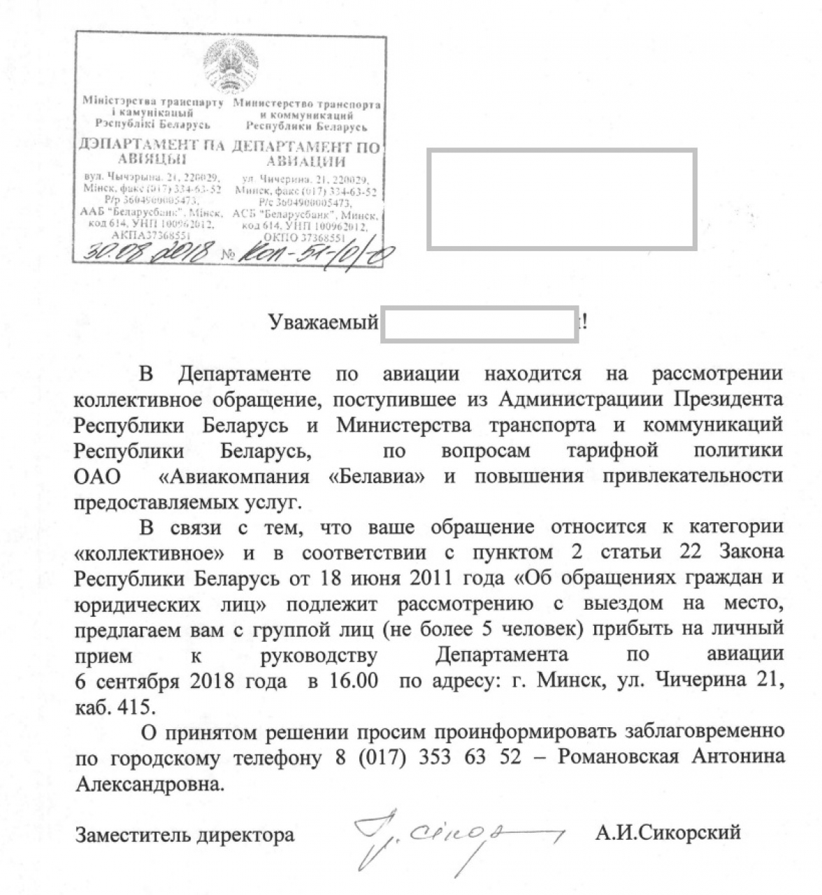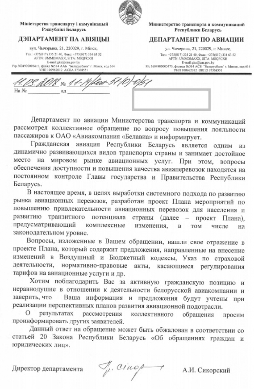 Просим вас осознать тот факт, что без существенного реформирования системы авиаперевозок в Беларуси, адаптации данной отрасли под нужды и потребности современного пассажира, национальная авиакомпания так и останется с не сильно высоким уровнем лояльности у белорусских клиентов и будет проигрывать конкуренцию другим авиакомпаниям, не сможет эффективно и быстро обновлять свой авиапарк и открывать новые конкурентные направления для полетов.