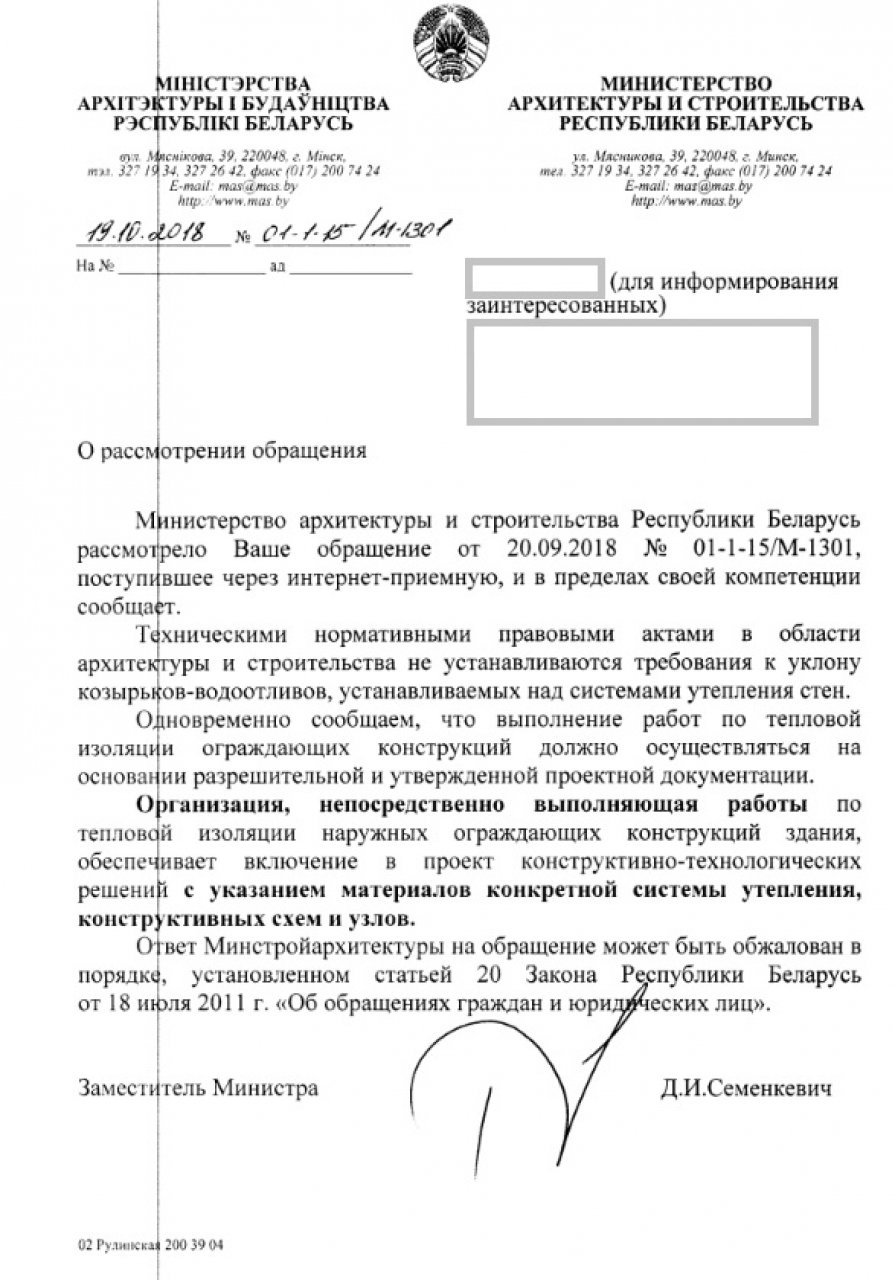 Министерство жилищно-коммунального хозяйства просим провести работы по замене уже установленных под небольшими углами козырьков-водоотливов, с установкой козырьков-водоотливов под большими углами. Финансовые затраты, связанные с выполнением данных работ, можно отнести на организации, производившие утепление.