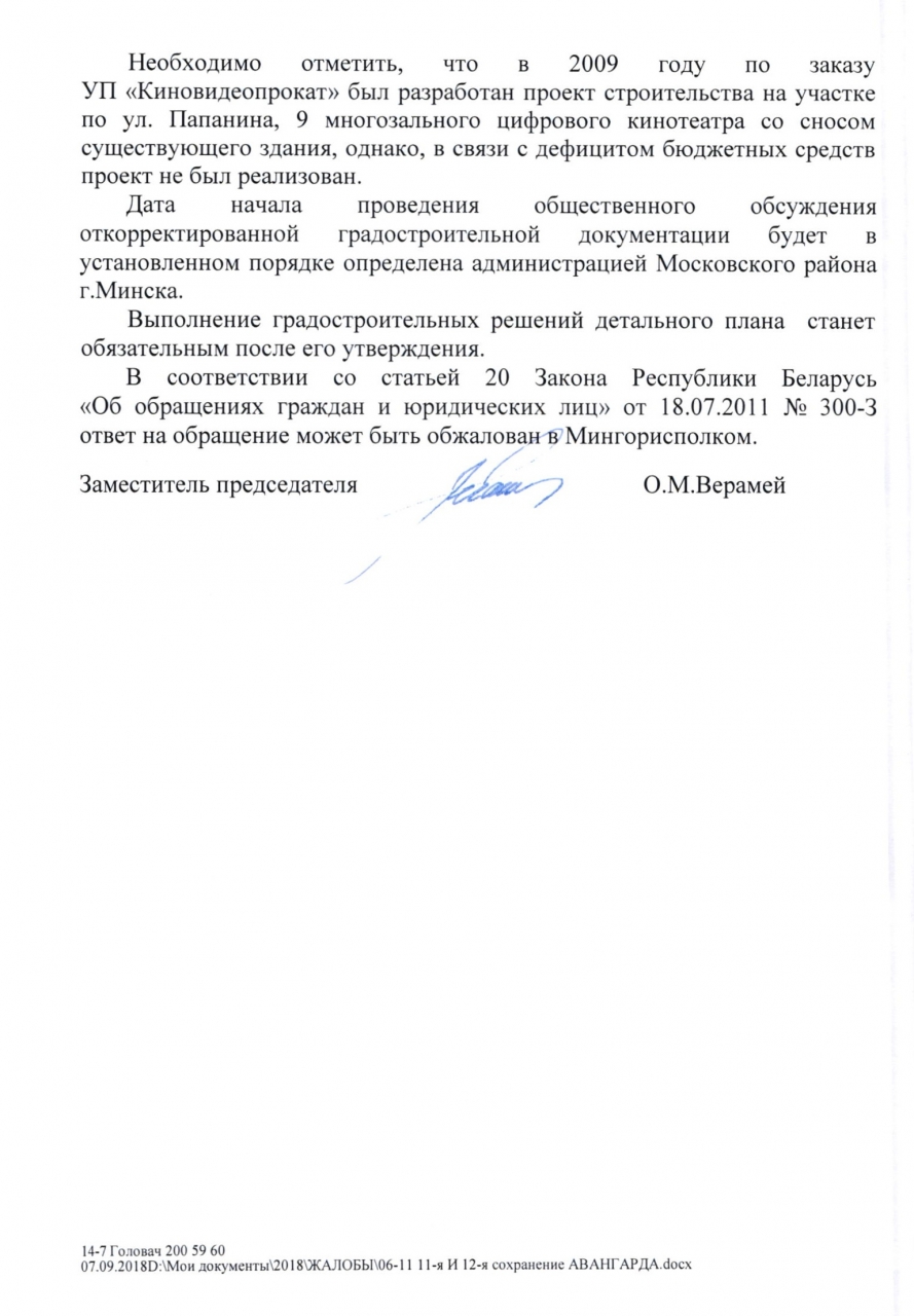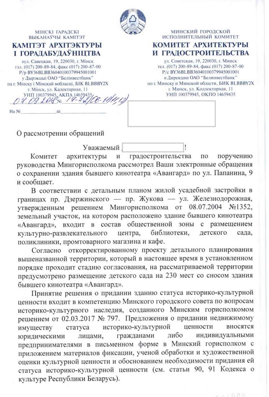 Решением Мингорисполкома от 08.07.2004 г. №1352 был утвержден Детальный план жилой усадебной застройки в границах пр.Дзержинского-пр.Жукова-ул.Железнодорожная (далее - ПДП), который не изменялся. Согласно детальному плану, здание кинотеатра Авангард располагается на территории функциональное назначение которой является - общественная застройка.
