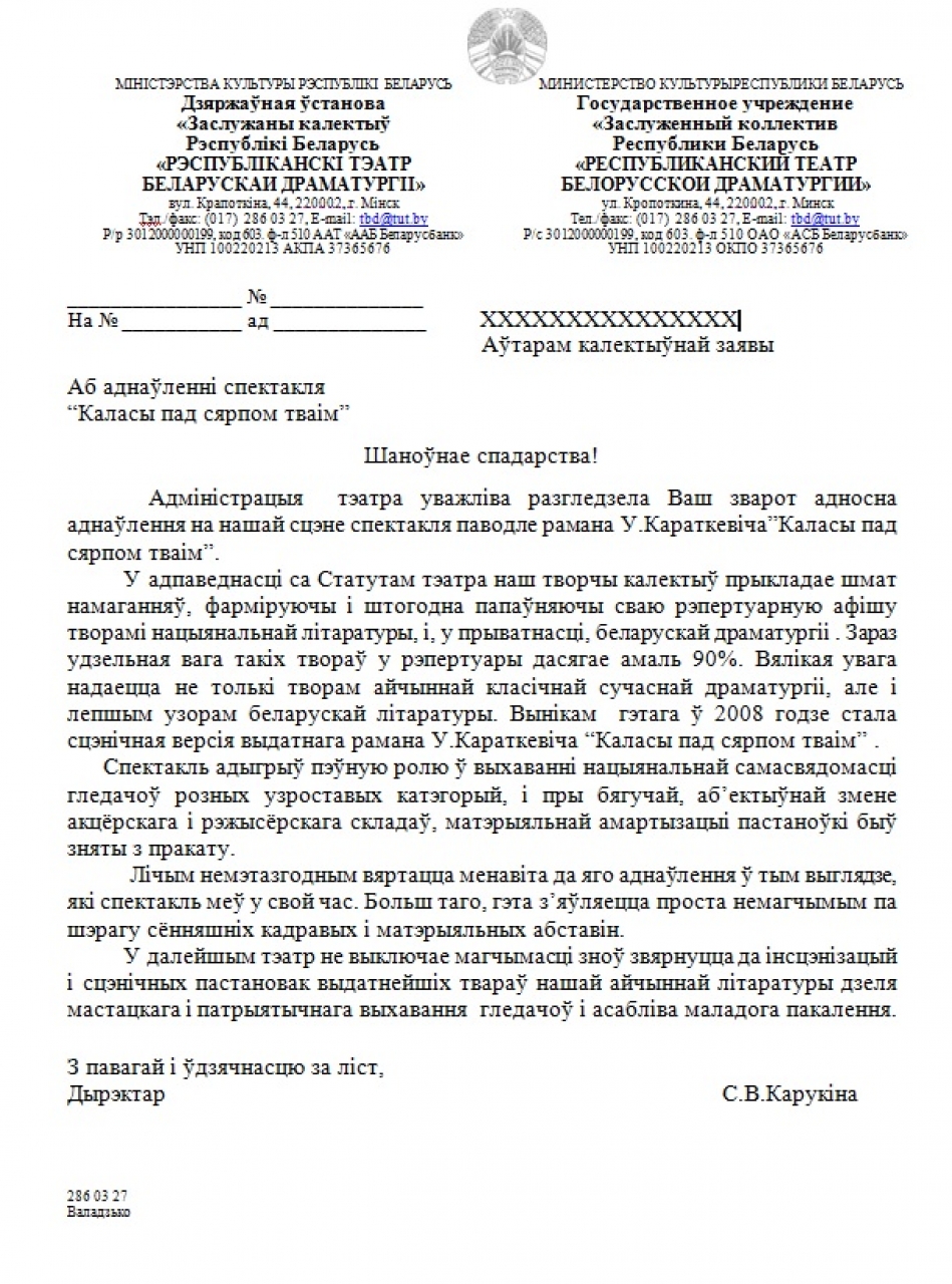 Таму просiм аднавiць спектакль «Каласы пад сярпом тваiм» паводле твора У.Караткевiча i зноў уключыць яго ў рэпертуар Рэспублiканскага тэатра беларускай драматургii.