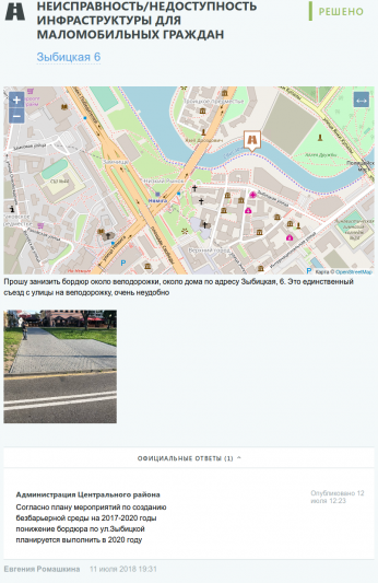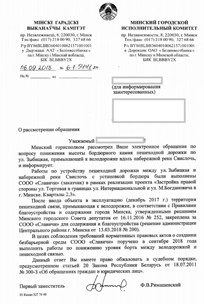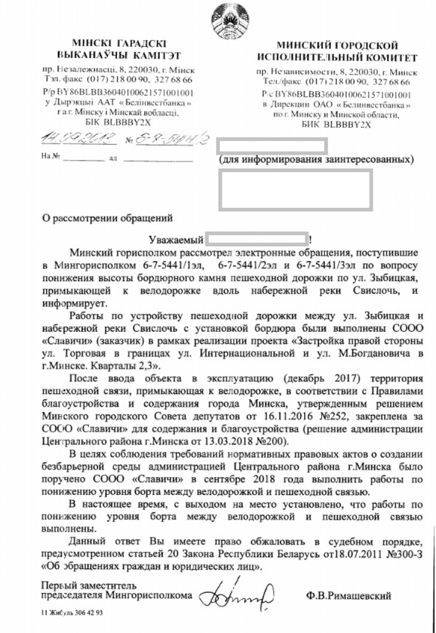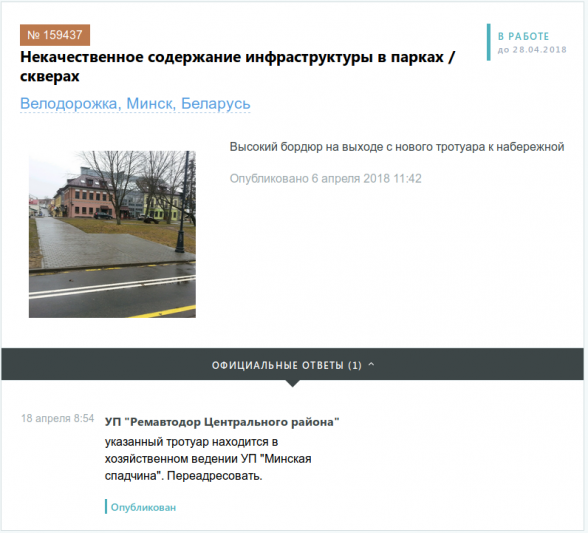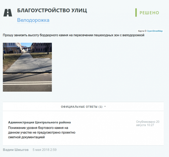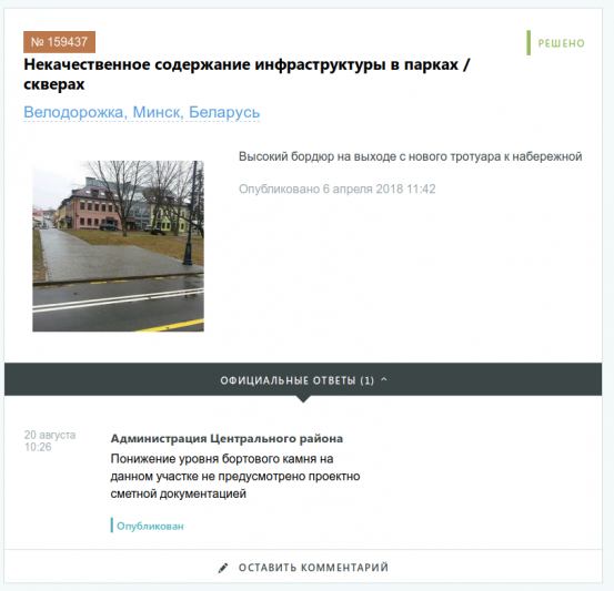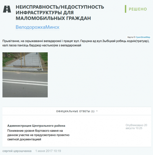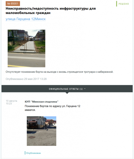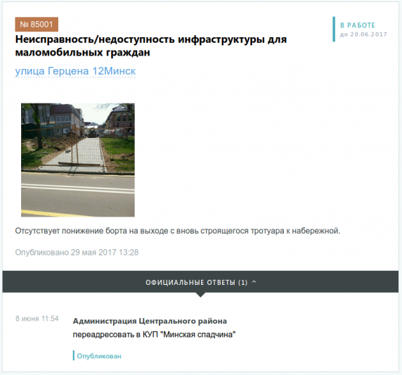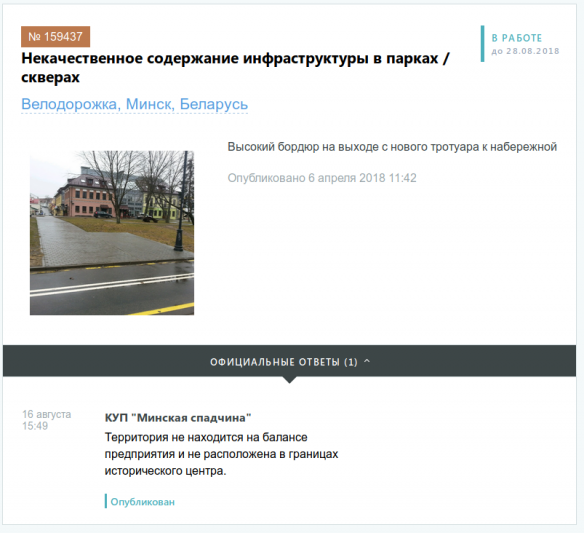 Для того, чтобы указать на наличие нарушения и принять меры по его устранению, была направлена заявка в контакт-центр Мингорисполкома с помощью сайта 115.бел (№85001 от 29 мая 2017 г.), затем, вследствие отсутствия ответа от КУП "Минская спадчина", повторная заявка (№159437 от 6 апреля 2018 г.). В августе 2018 года на данные заявки был получен ответ, что понижение бортового камня в данном месте не предусмотрено проектной документацией (см. приложенные фото), что является прямым нарушением требований строительных норм.