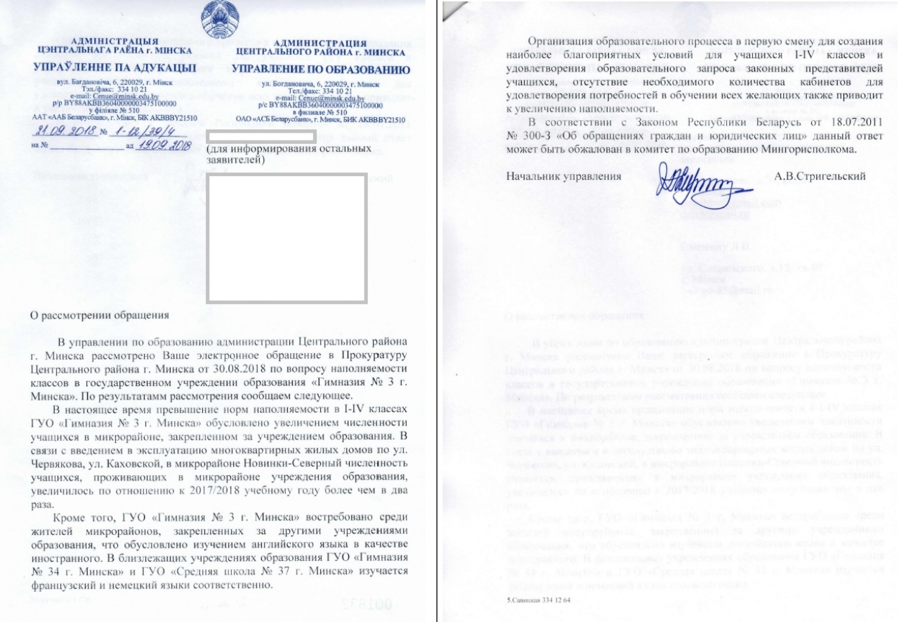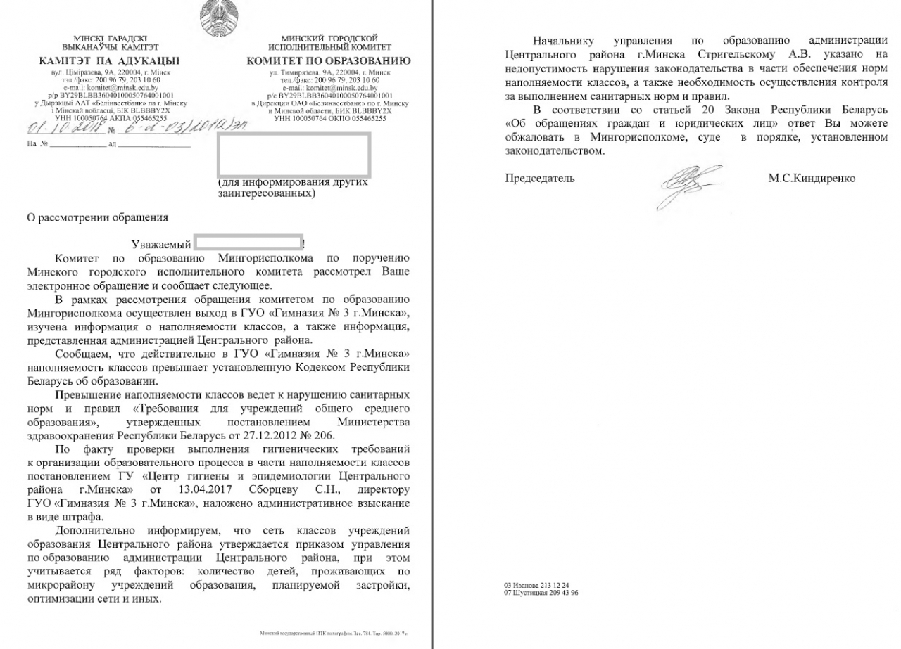 В ответе от 07.06.2018 №1-13/512/2 администрации Центрального района г. Минска указывается, что «наполняемость отдельных классов превышает численность, установленную Кодексом об образовании, по причине необходимости реализации прав граждан на получение образования и недопущения социальной напряжённости». Данные причины не предусмотрены Кодексом об образовании и иными законодательными актами Республики Беларусь. К тому же, превышение численности классов создаёт условия для нарушения прав обучающихся на охрану жизни и здоровья во время образовательного процесса.