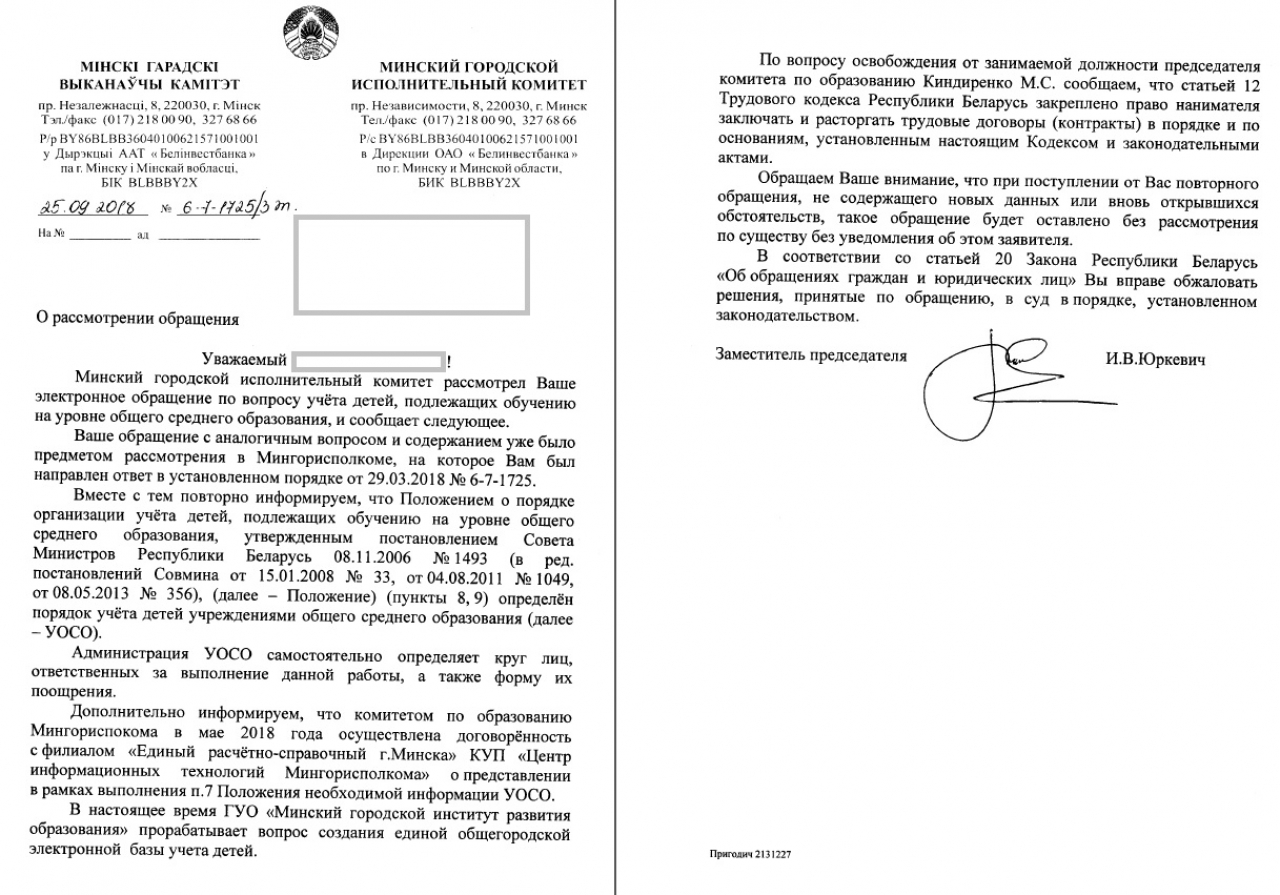 Основным документом, регулирующим учёт детей, подлежащих обучению, является Постановление Совета Министров Республики Беларусь «Положение о порядке организации учёта детей, подлежащих обучению на уровне общего среднего образования, и признании утратившими силу некоторых постановлений Совета Министров БССР» от 08.11.2006 № 1493 (далее – Постановление №1493). При проведении учёта детей управлениями по образованию полностью игнорируются требования главы 1 п. 4 Постановления №1493, а также полностью игнорируется порядок проведения учёта детей в соответствии с главой 2 Постановления №1493, о чём, видимо, Киндиренко М.С. не знает.