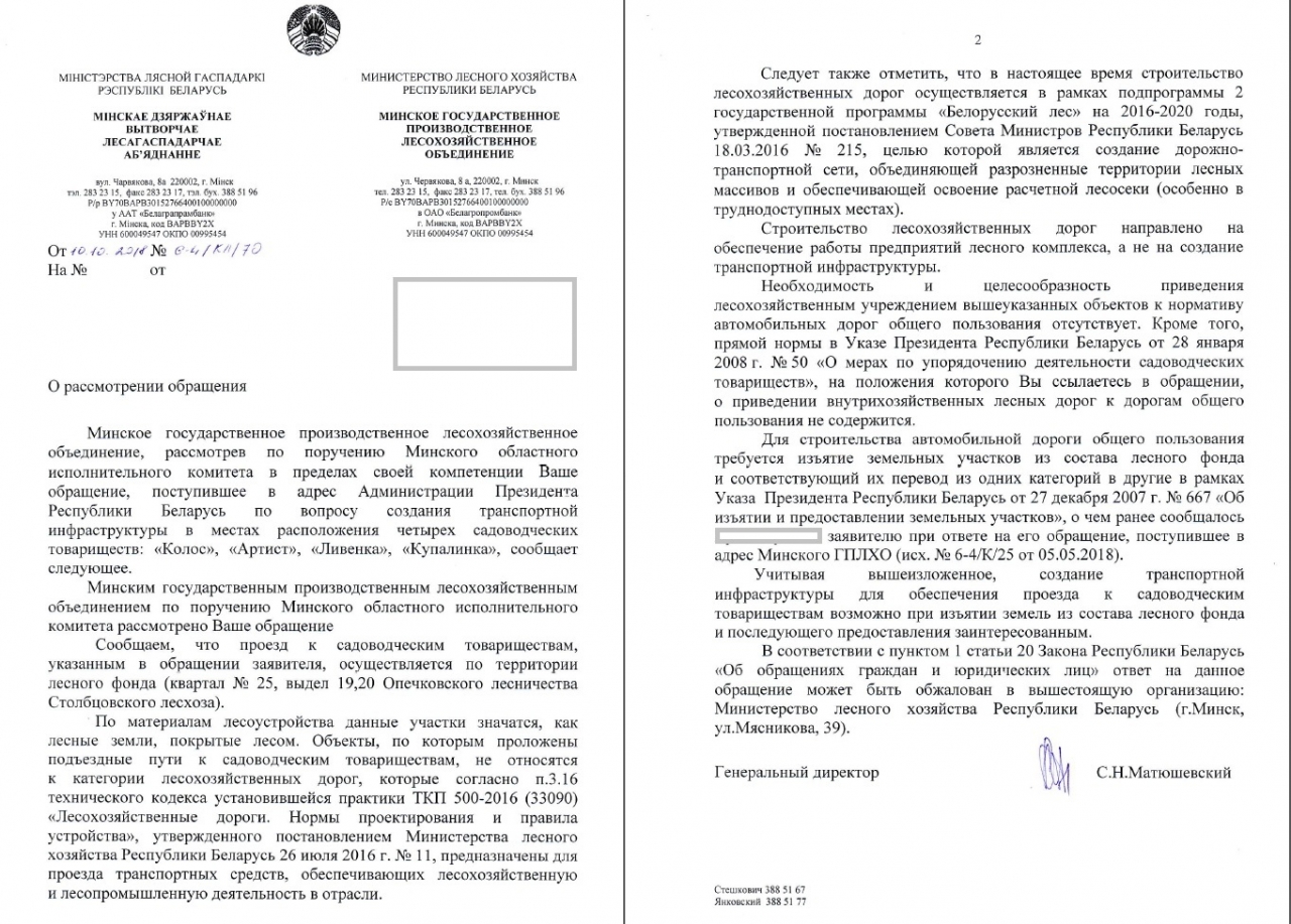 В своём ответе Минский облисполком указал, что существующие транспортные проезды к указанным товариществам являются внутрихозяйственными дорогами ГОЛХУ "Столбцовский опытный лесхоз".