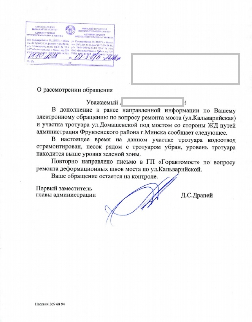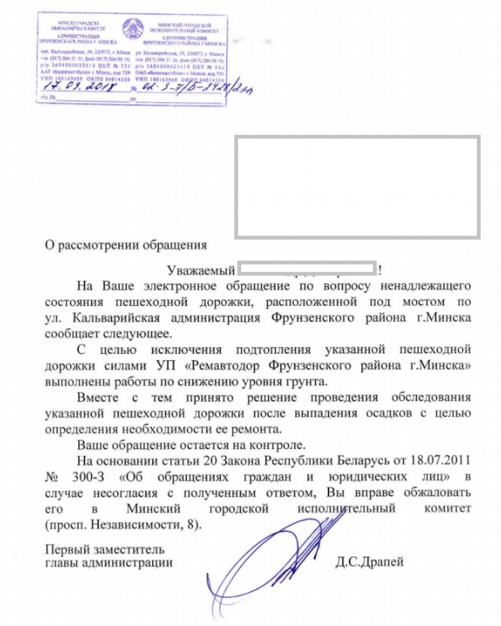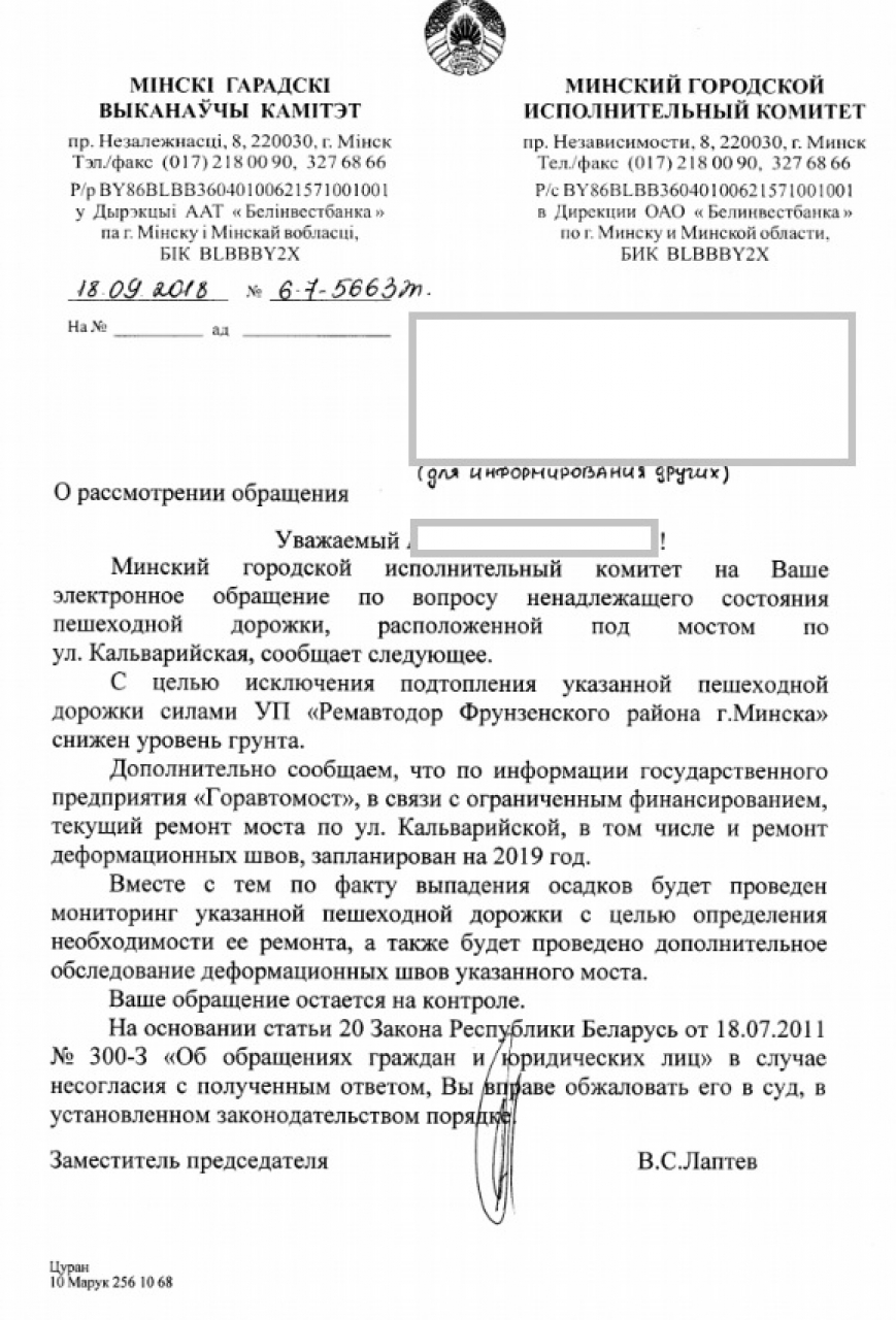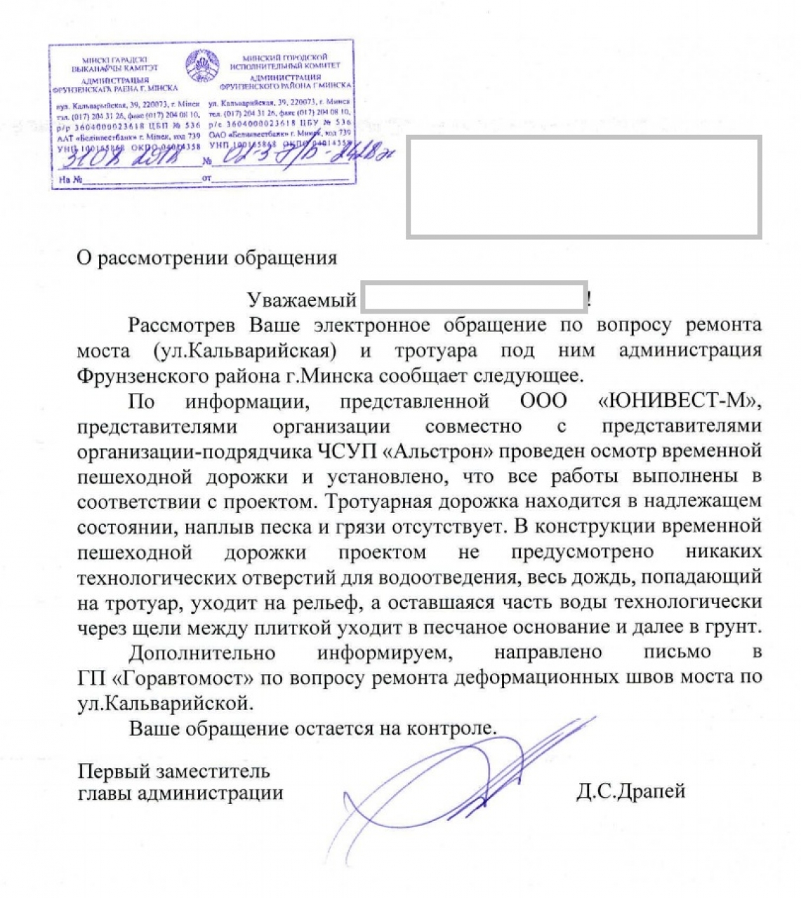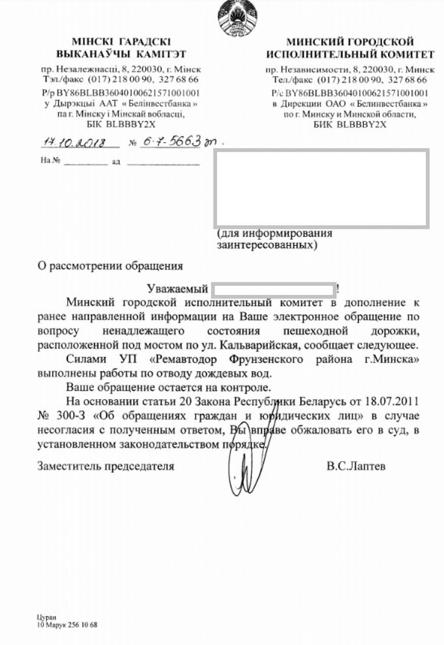 Обращение касалось участка тротуара под мостом ул.Кальварийская, а не пешеходной дорожки, проходящей под мостом ул.Домашевская вдоль ЖД, о котором был дан ответ. Дорожка, как раз, сделана замечательно, по технологии, и если бы все тротуары в городе делали так, луж бы на них не было вообще. Но её делал застройщик Юнивест-М, а не государственные службы.