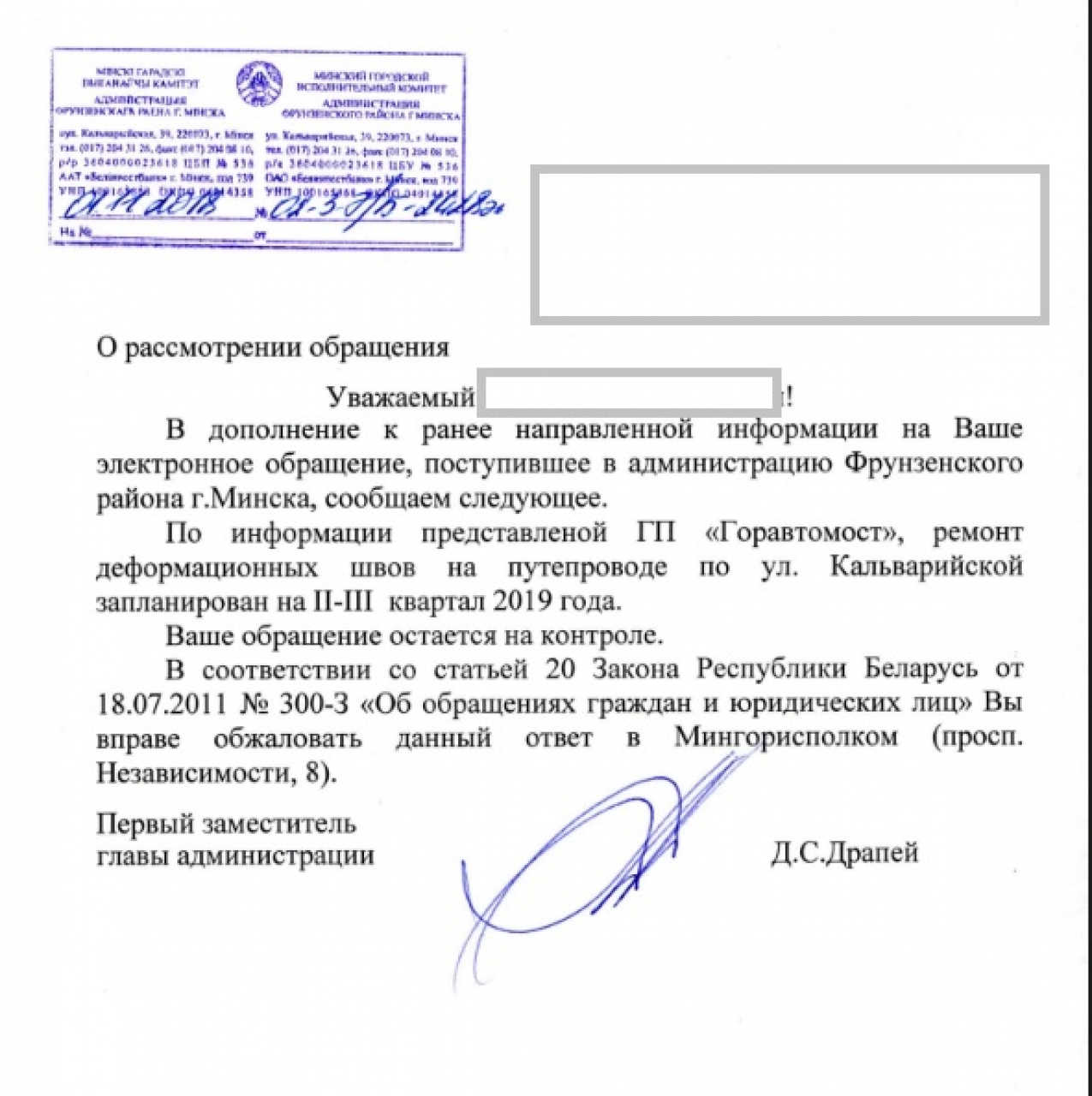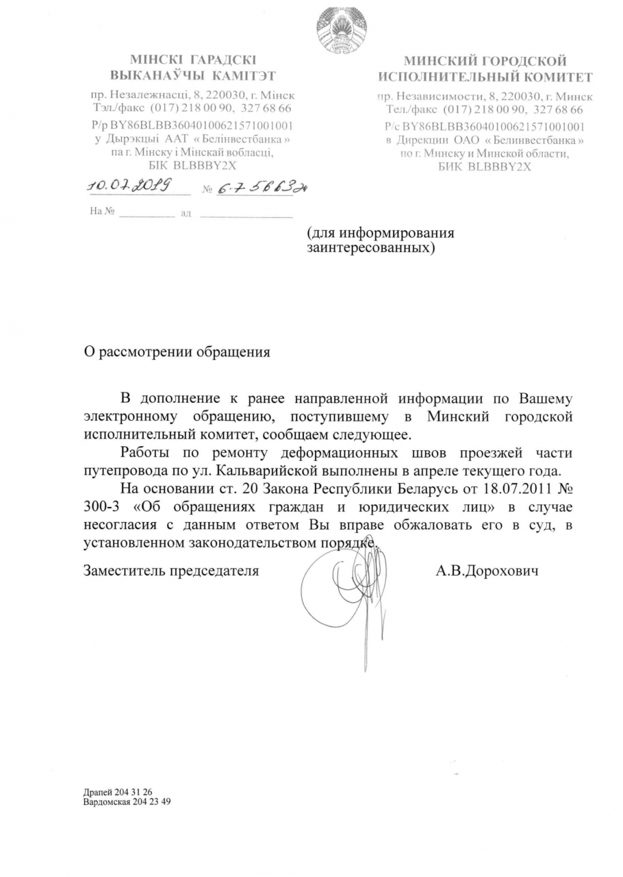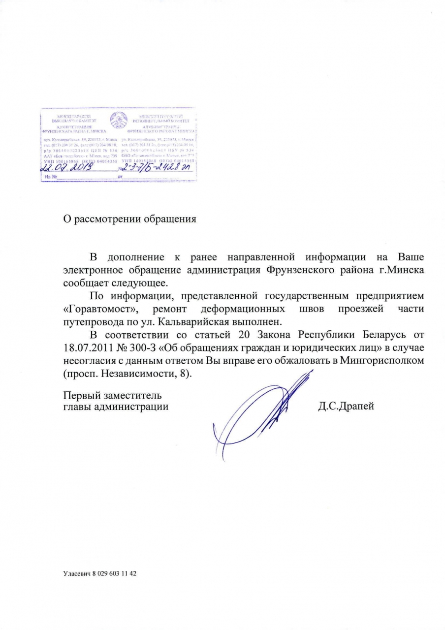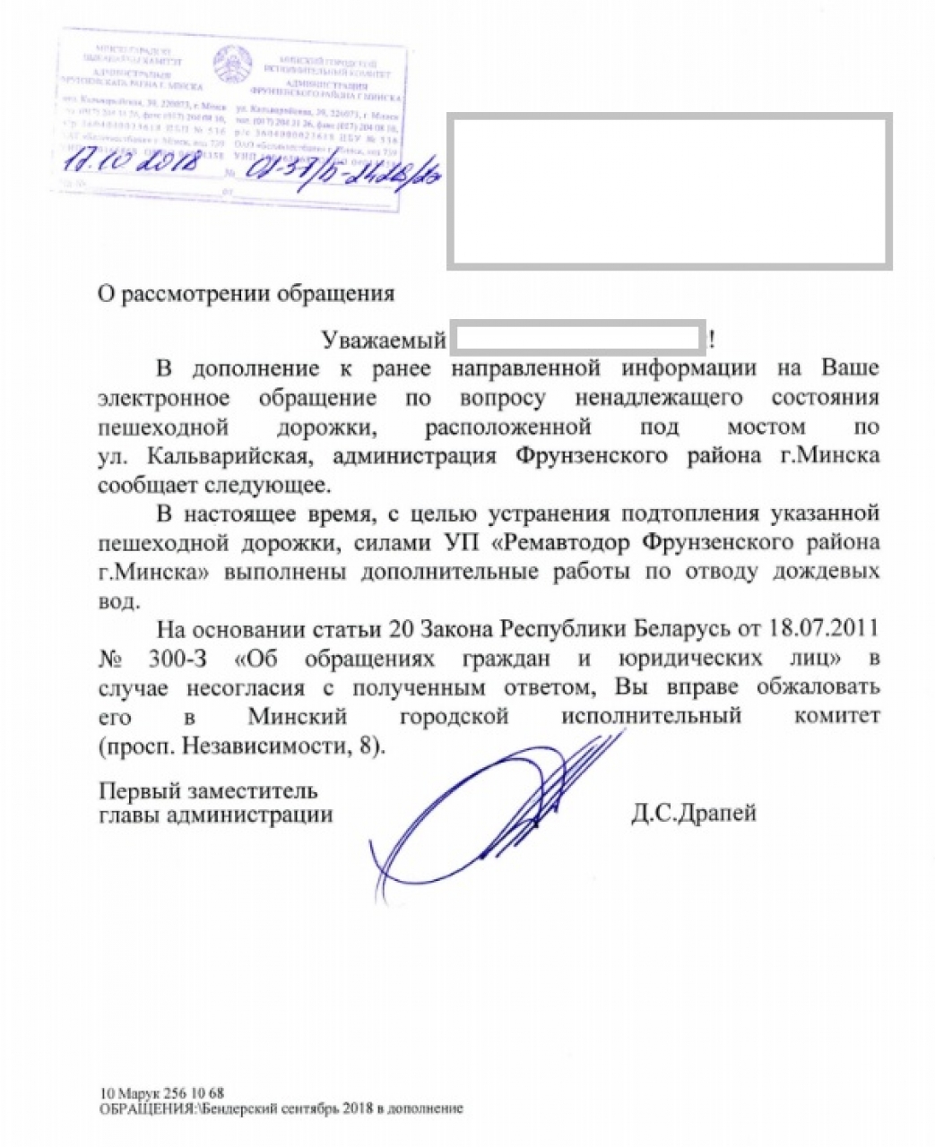 Обращение касалось участка тротуара под мостом ул.Кальварийская, а не пешеходной дорожки, проходящей под мостом ул.Домашевская вдоль ЖД, о котором был дан ответ. Дорожка, как раз, сделана замечательно, по технологии, и если бы все тротуары в городе делали так, луж бы на них не было вообще. Но её делал застройщик Юнивест-М, а не государственные службы.