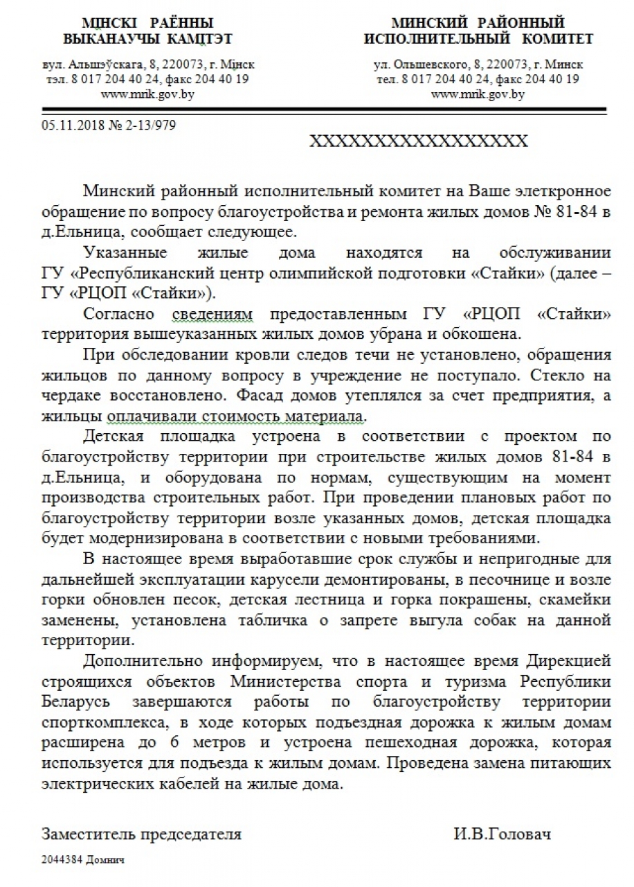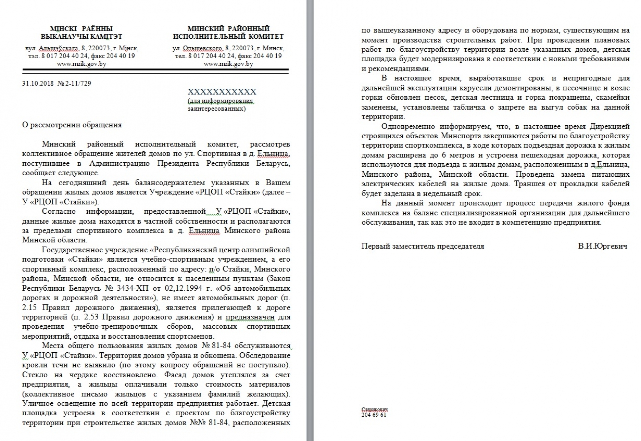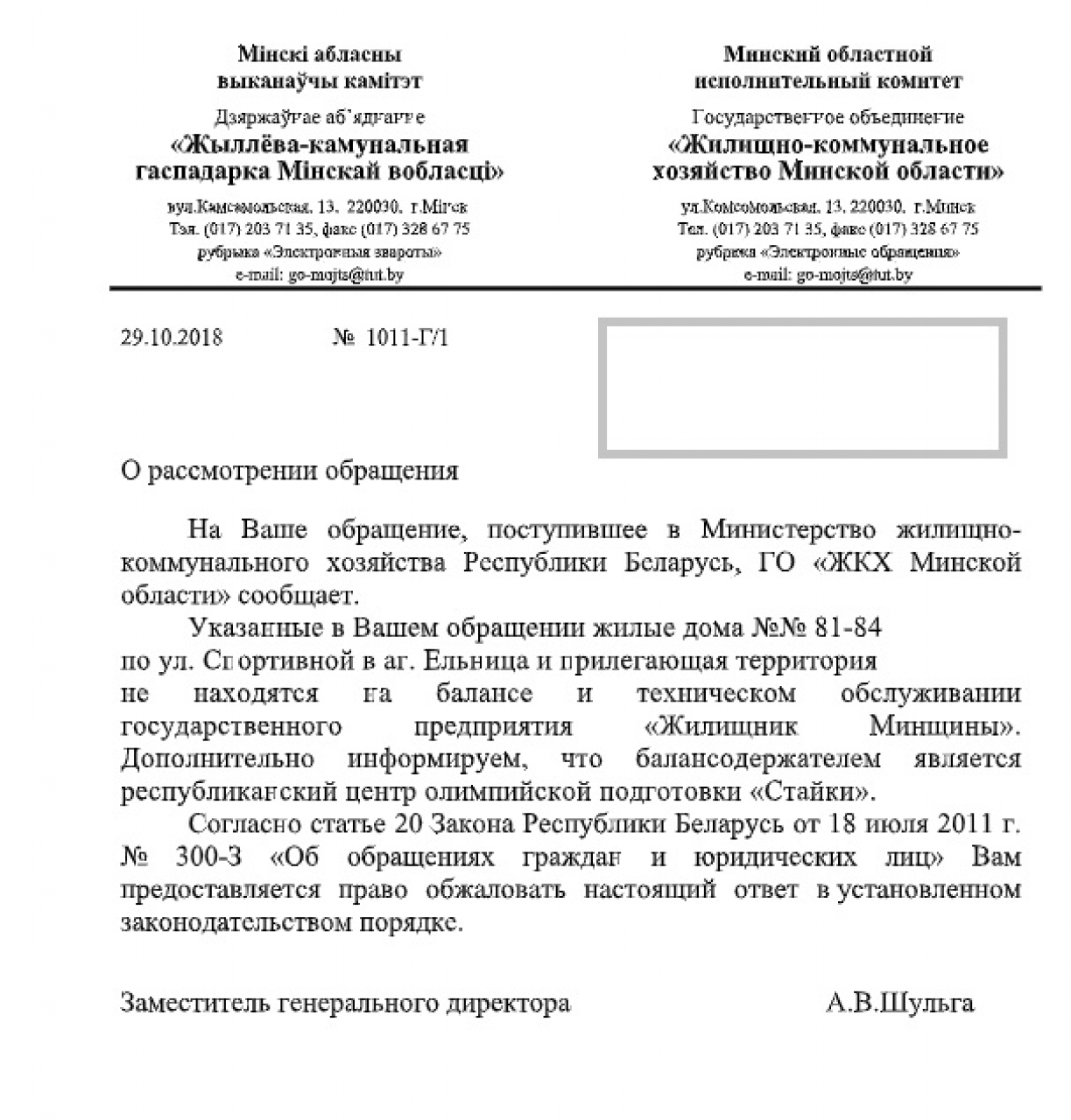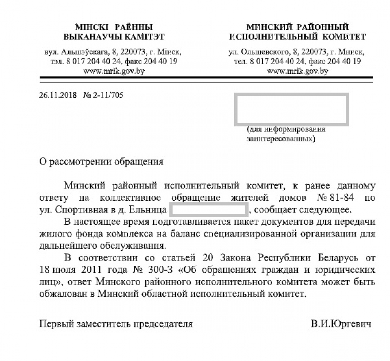 В связи с вышеизложенным и на основании статьи 41 Закона Республики Беларусь «О местном управлении и самоуправлении», которая устанавливает, что исполкомы обеспечивают государственные минимальные социальные стандарты, организуют работу по благоустройству, обеспечению надлежащего санитарного состояния, озеленению территорий населенных пунктов, организуют строительство, реконструкцию, ремонт и содержание местных автомобильных дорог, осуществляют контроль в областях благоустройства соответствующей территории, дорожного строительства, коммунально-бытового и социального обслуживания граждан, просим: