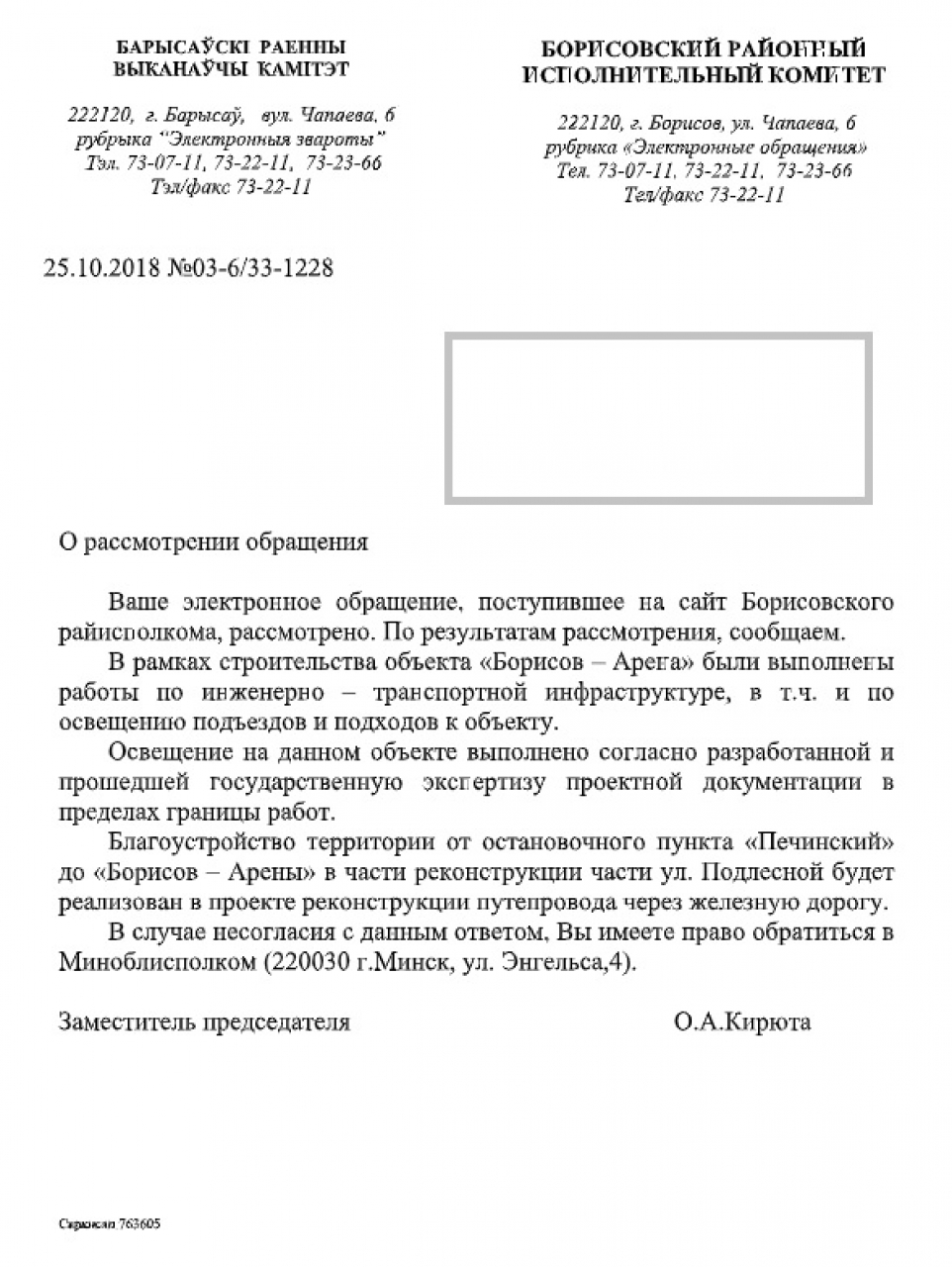 На основании статьи 43 Закона Республики Беларусь «О местном управлении и самоуправлении», которая устанавливает, что исполкомы базового уровня обеспечивают безопасность дорожного движения, организуют освещение улиц, просим принять меры по созданию и благоустройству пешеходной дороги, ведущей от остановочного пункта "Печинский" к стадиону "Борисов-Арена".