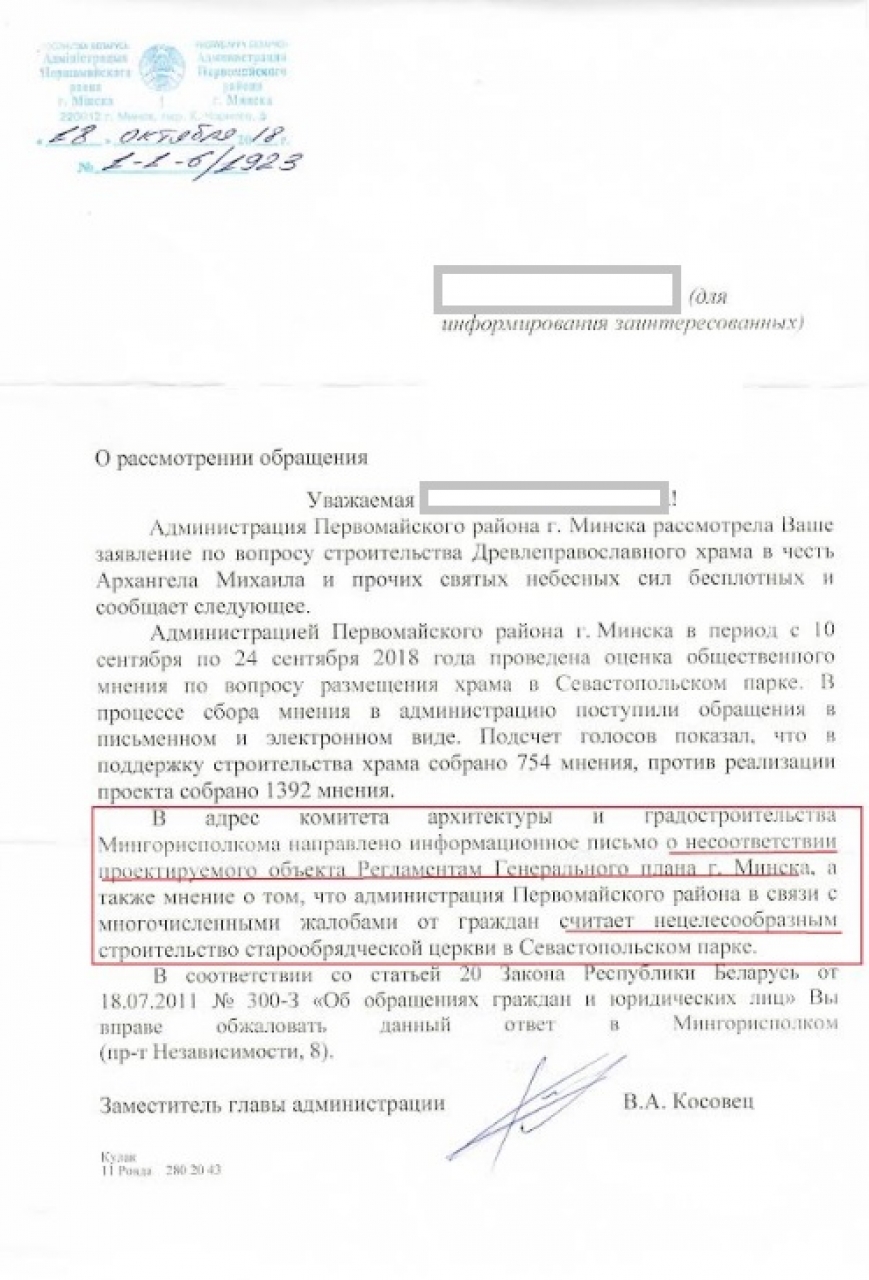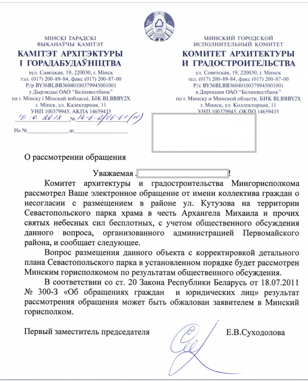 Вместе с тем, на территорию Севастопольского парка решением Мингорисполкома от 14.2.2018 №253 был утвержден план детального планирования (фото прилагается) и никакого храма в районе ул.Кутузова не предусмотрено. Более того, согласно утвержденного плана, на месте планируемого строительства храма должна пролегать лыжно-роллерная трасса! По утвержденному плану Севастопольский парк должен значительно преобразиться - в нем должны появиться различные спортивные площадки, корты, детские городок, велодорожки много другое. Но из всего предусмотренного планом за 10 лет началось строительство лишь комплекса общепита вблизи Логойского тракта 22 (не самый нужный объект для жителей).