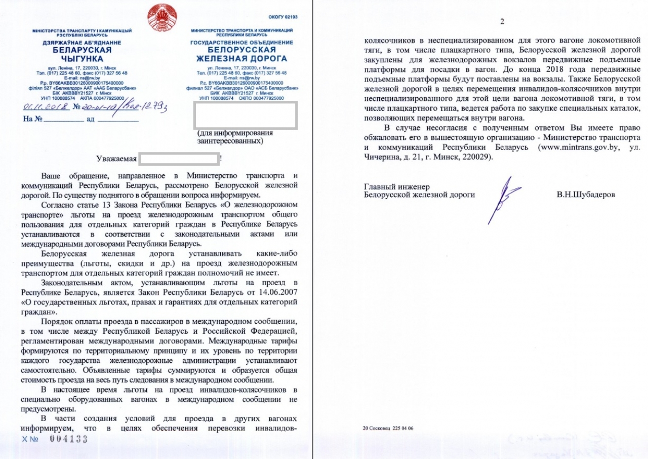 Таким образом, учитывая изложенное, а также руководствуясь пунктом а) статьи 20 Конвенции о правах инвалидов (ратифицированной Республикой Беларусь), определяющим, что государства-участники содействуют мобильности инвалидов избираемым ими способом, в выбираемое ими время и по доступной цене, и на основании пункта 10 Устава государственного объединения «Белорусская железная дорога», утвержденного постановлением Совета Министров от 10.01.2009 N 19, который устанавливает, что главными целями деятельности Белорусской железной дороги являются обеспечение потребностей государства, юридических и физических лиц в железнодорожных перевозках, просим: