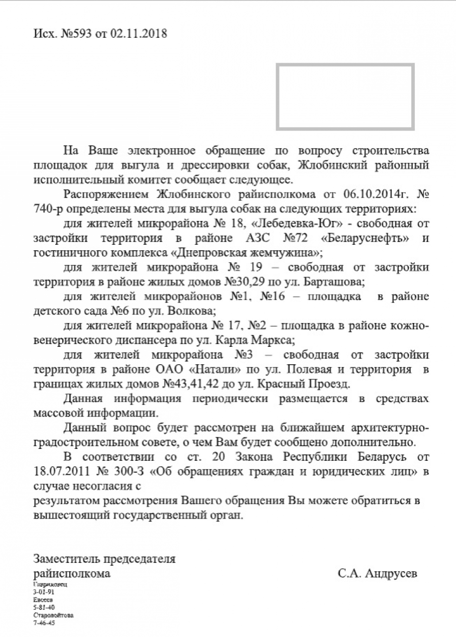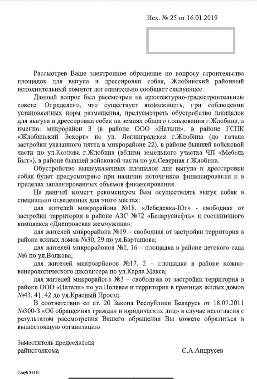 По информации, размещенной на сайте Жлобинского Районного Исполнительного Комитета на 11 сентября 2019 года (http://gisp.gov.by/index.php/aktualnaya-informatsiya/5917-pravila-soderzhaniya-domashnikh-sobak-koshek-otlova-beznadzornykh-zhivotnykh), для выгула собак определены следующие территории: