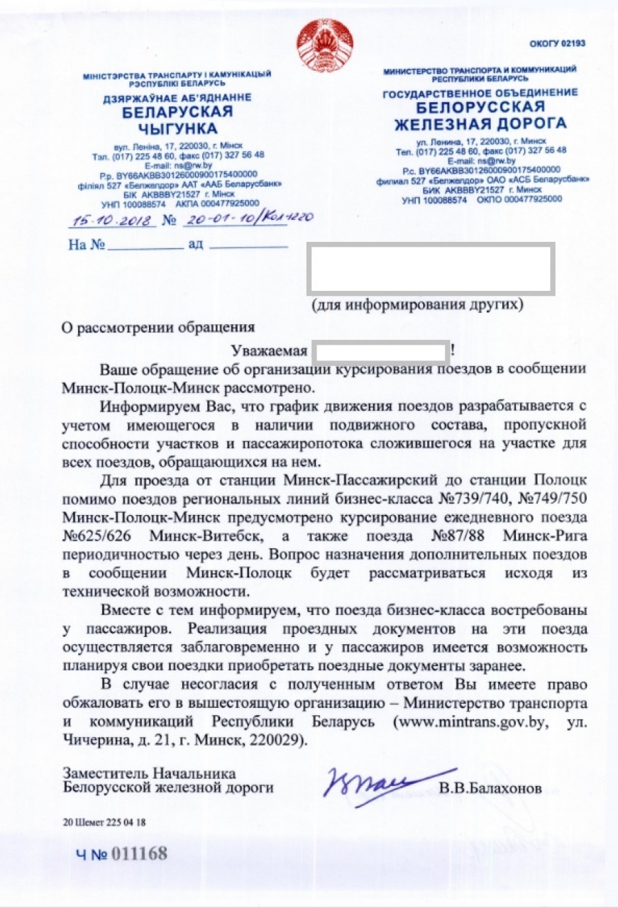 В связи с вышеизложенным и на основании пункта 10 Устава государственного объединения «Белорусская железная дорога», утвержденного постановлением Совета Министров от 10.01.2009 N 19, который устанавливает, что главными целями деятельности Белорусской железной дороги являются обеспечение потребностей государства, юридических и физических лиц в железнодорожных перевозках, просим увеличить количество поездов, следующих по пути Минск-Полоцк-Минск, особенно по выходным.