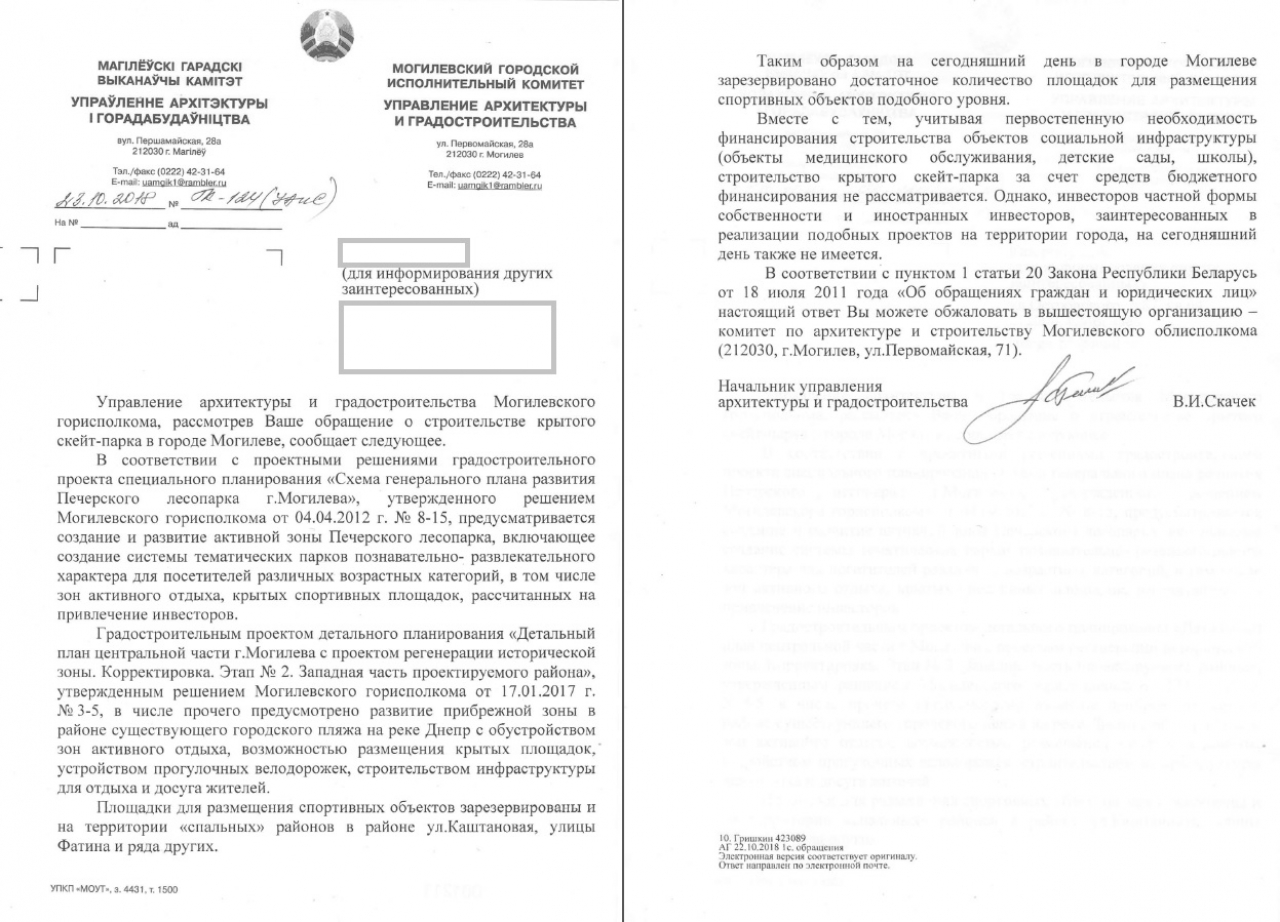 В настоящее время в Могилеве зарезервировано достаточно площадок для строительства спортивных объектов. Строительство скейт-парка не планируется ввиду отсутствия финансирования.