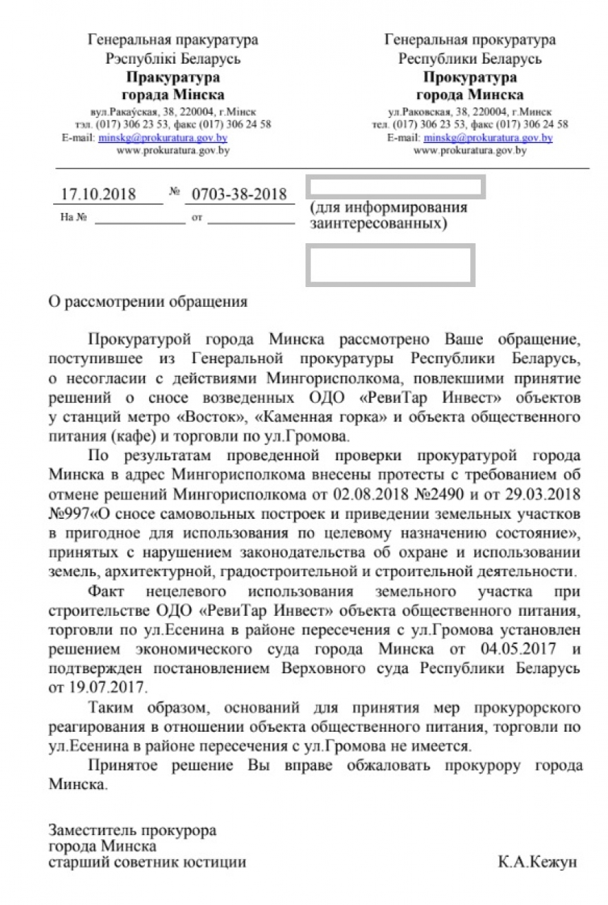 Следует пояснить, что до 2015 года к предприятию не предъявлялось никаких претензий и требований, все объекты были зарегистрированы и возведены в соответствии с законодательством и с разрешения всех уполномоченных органов, однако, в 2015 году на совещании в Мингорисполкоме с участием представителей сербской компании «Зомекс Инвестмент» ими был поднят вопрос о сносе объектов на ст.м. «Восток», расположенных около возводимого ими торгового центра «Dana Mall». Предприятию «РевиТар Инвест» было разъяснено, что его объекты общественного питания возле метро следует снести, поскольку они не вписываются в застройку торгового центра, а также в связи с «решением, уже принятым сверху» Эти же слова неоднократно были высказаны главным архитектором Минского городского исполнительного комитета - председателем Комитета архитектуры и градостроительства Лучиновичем П.С.