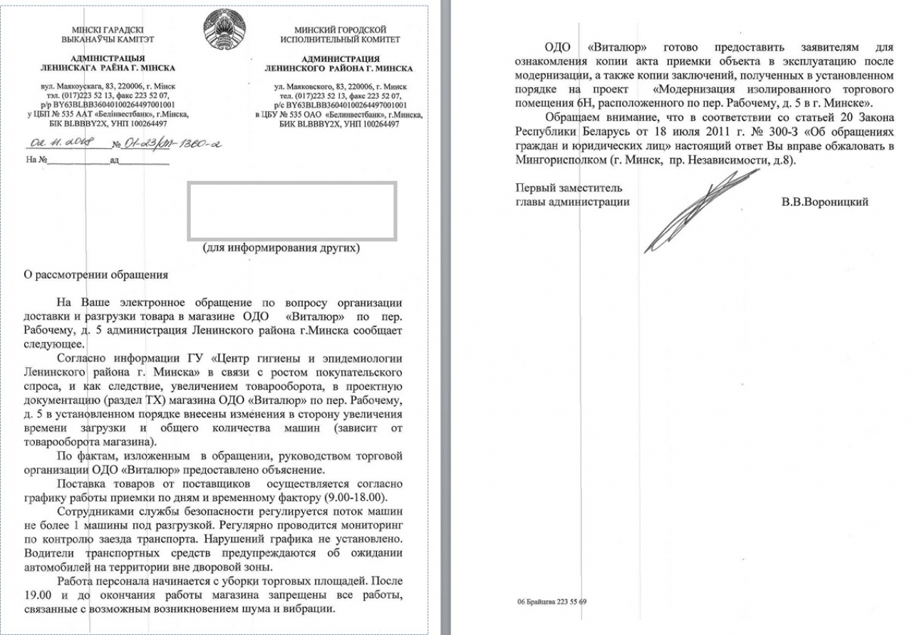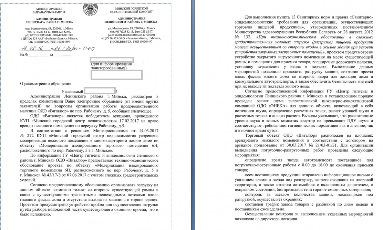 В ответе администрации Ленинского района г. Минска от 18.09.18 №01-23/21-1360 на наше обращение по поводу деятельности магазина “Виталюр”, расположенного по адресу переулок Рабочий 5 в Минске, не затронут один важный момент.