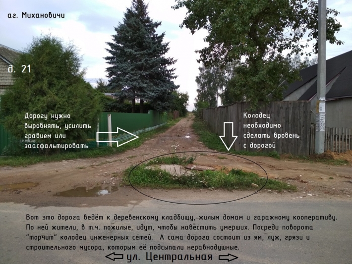 4. Дорога на проезде с ул. Центральной (между домами 21 и 23) к деревенскому кладбищу в недопустимом состоянии: посреди дороги выступает железобетонный колодец инженерных сетей, на дороге множественные выбоины глубиной более 10 см, а сама она состоит из остатков строительного мусора, которым её укрепляли неравнодушные люди. Данная дорога ведёт к жилым домам, гаражному кооперативу и деревенскому кладбищу, ею пользуются пожилые люди. Дорогу необходимо выровнять, покрытие усилить гравием/щебнем или заасфальтировать.