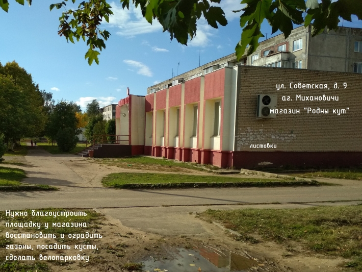 9. Площадка у магазина “Родны кут” (ул. Советская, д. 9) в отвратительном состоянии: газоны вытоптаны, в дождь магазин окружают лужи и грязь. Необходимо оградить зелёные зоны, восстановить газоны, высадить кусты. Также нужно сделать велопарковку, т.к. для многих жителей велосипед - это основной транспорт.
