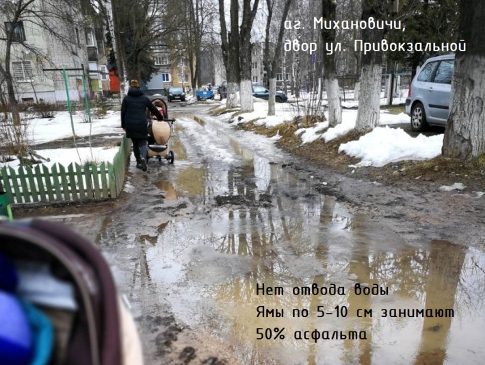 Мы, жители Михановичского сельсовета и просто активные граждане считаем, что уходящий Год малой родины в агрогородке Михановичи прошёл неудовлетворительно: как и 10 лет назад мы ходим по тёмным обочинам шоссе, наматываем километры в обход железной дороги и тонем в грязи после каждого дождика.