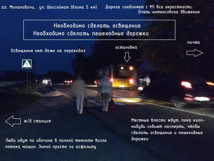 1. В аг. Михановичи по ул. Шоссейной необходимо сделать освещение и пешеходные дорожки. Ул. Шоссейная идёт от единственного на 10 км съезда с М1. На этой улице очень интенсивное движение, это действительно шоссе. Длина улицы составляет 5 км, на ней жилые дома, почта, библиотека, музыкальная школа, магазины и главный транспортный узел - ж/д станция. С неё люди вынуждены идти на работу или к своим домам по обочине дороги с очень интенсивным движением и совершенно без единого фонаря. Зимой, когда обочины не пригодны для ходьбы, люди идут просто по асфальту, в темноте, рядом с потоком машин. Дети ждут школьный автобус на обочине дороги. Там страшно ехать и ещё страшнее идти. Освещения нет даже на пешеходных переходах. На все 5 км улицы – 700 м разбитой пешеходной дорожки, оставшейся с СССР, зимой её даже не чистят. Пока никого не сбили насмерть, необходимо сделать освещение и пешеходные дорожки.