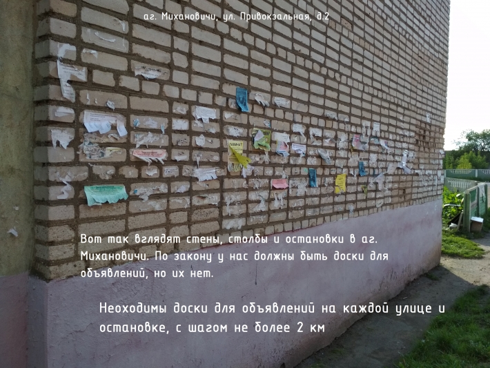 7. В агрогородке остро стоит проблемы огромного количества листовок на зданиях, столбах, остановках и даже деревьях. Но причина кроется в том, что в агрогородке недостаточно специально установленных мест для размещения объявлений. Даже объявление о пропавшей кошке часто негде повесить. Согласно п. 17 постановления СовМина РБ от 28.11.2012 №1087 "Об утверждении Правил благоустройства и содержания населенных пунктов", размещение объявлений осуществляется в специально предназначенных местах, определенных местными органами. Ранее одна такая доска стояла на ул. Привокзальной, на выходе из ж/д станции, но и та пропала. Требуем разместить доски для объявлений граждан на остановках общественного транспорта, на железнодорожной станции, у магазинов, на перекрёстках в частном секторе.