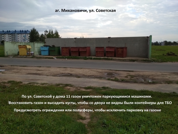 8. По улице Советской, у д. 11 зелёные зоны напротив площадки для контейнеров ТБО уничтожены паркующимися машинами. Необходимо принять меры для недопущения парковки на газоне (ограждение или полусферы), восстановить газон и высадить кусты, чтобы со двора не видны были контейнеры для ТБО.