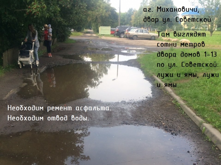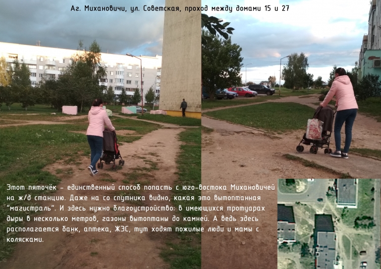 5. По ул. Советской проход между домами 15 и 27 находится в отвратительном состоянии: ямы на тротуарах шириной более метра, глубиной до 10 см, газоны вытоптаны, в дождь там скользкая грязь. Даже фонарь тут не работает. А через это место ежедневно проходит весь юго-восток Михановичей на ж/д станцию: он соединяет ул. Советскую и пер. Привокзальный. В доме 15 располагается аптека, банк и ЖЭС. Необходимо произвести ремонт и благоустройство данной территории с учётом потока людей: сделать широкие тротуары, восстановить газоны, высадить кусты и деревья.