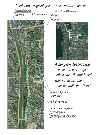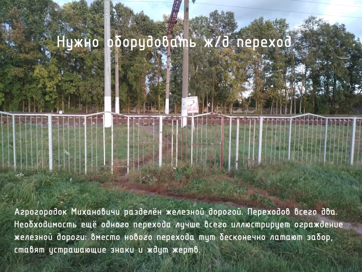 2. А/г Михановичи разделен на 2 части железнодорожным полотном. С одной стороны школа, магазины, поликлиника, сельсовет и т. д. Со второй стороны почта, библиотека, музыкальная школа и частная застройка. Переходов через ж. д. дорогу только 2, причем безопасным можно назвать только 1 из них. Расстояние между переходами тоже довольно внушительное (более 1 километра). Для того, чтобы ребенок просто перешел из общеобразовательной школы в музыкальную, необходимо пройти большое расстояние по дорогам без пешеходных дорожек, нормальных обочин и освещения (ул. Шоссейная). А поход с детской коляской с одной половины на вторую может превратиться в настоящее кругосветное путешествие.