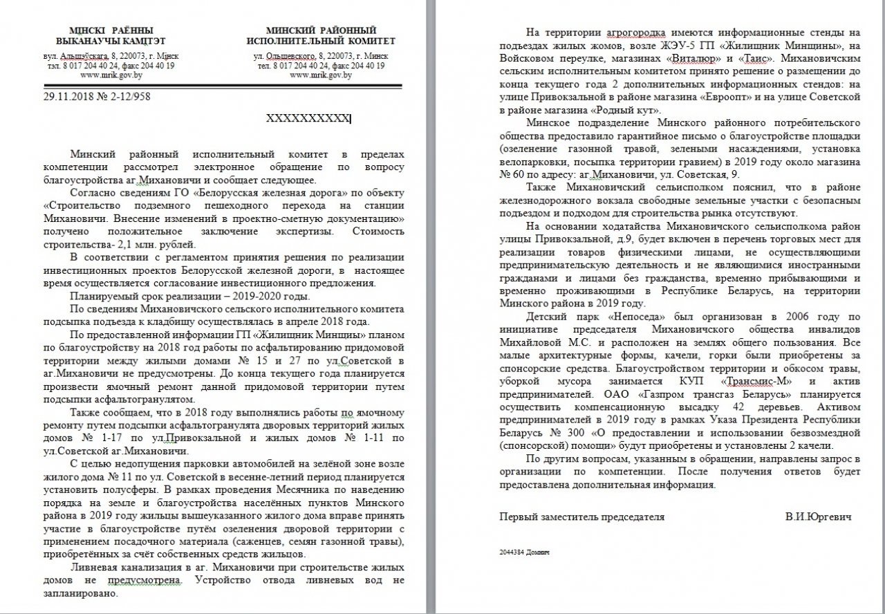 На основании статьи 41 Закона Республики Беларусь "О местном управлении и самоуправлении", относящейся вопросы дорожного строительства, благоустройства, выполнения социальных стандартов к компетенции исполкомов, просим принять меры, направленные на выделение финансирования и организацию благоустройства территории и дорожного строительства.