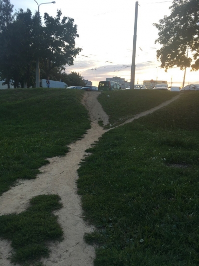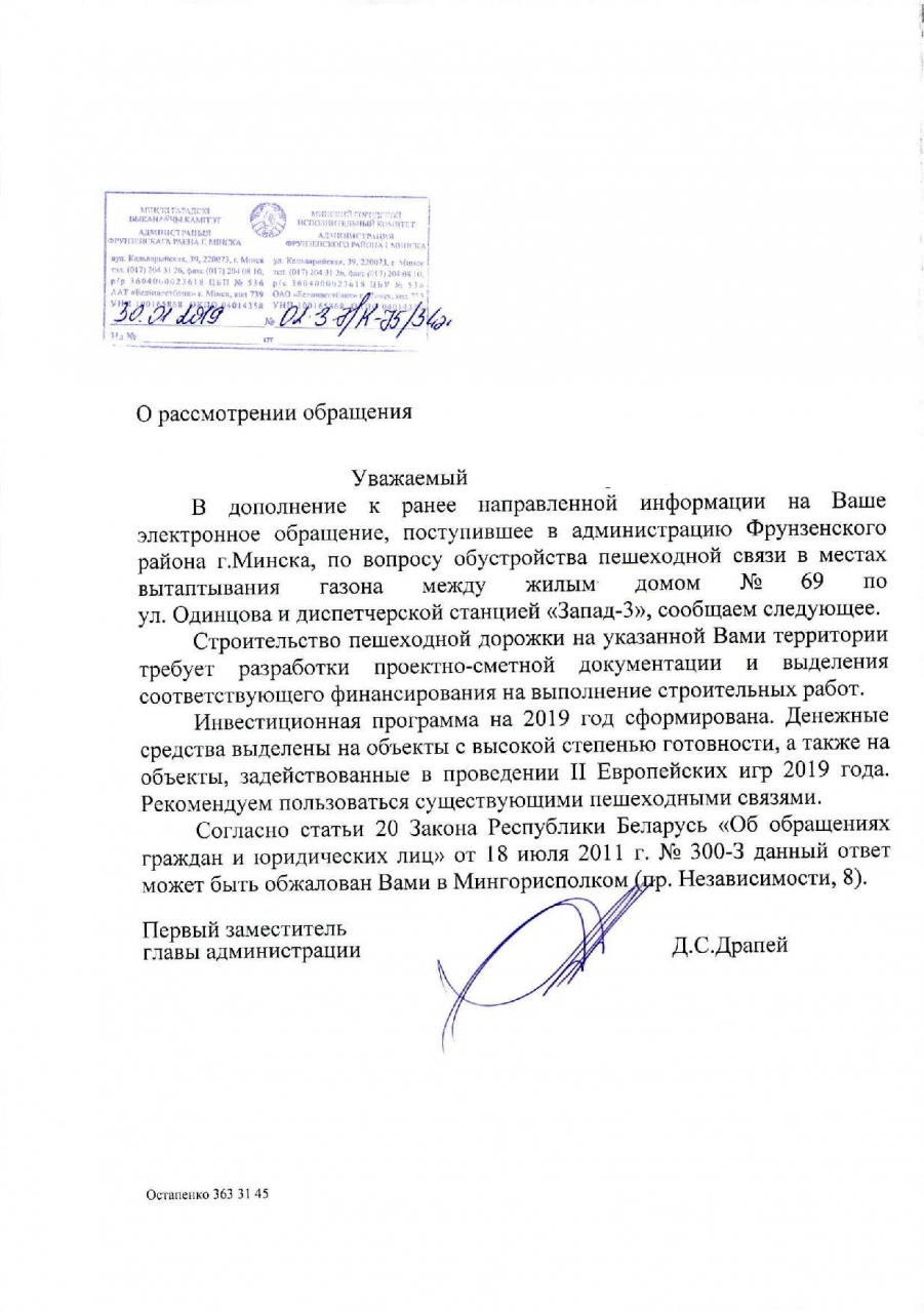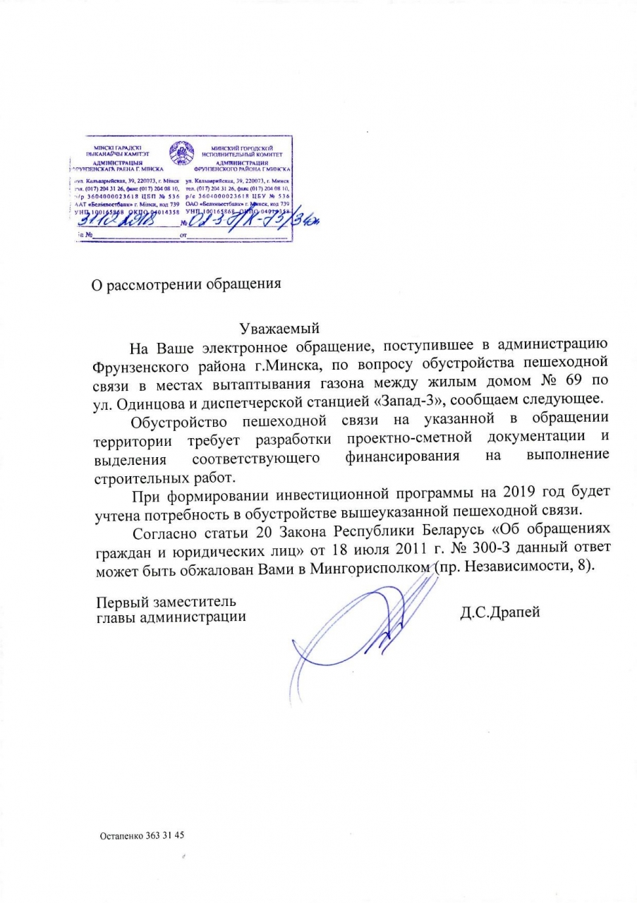Просим в соответствии со ст. 45 Закона Республики Беларусь «О местном управлении и самоуправлении», которая устанавливает, что местные администрации обеспечивают благоустройство и поддержание надлежащего санитарного состояния на соответствующей территории, на основании восьмого абзаца пункта 22 Правил благоустройства и содержания города Минска, утверждённых 16.11.2016 решением №252 Минского городского Совета депутатов (в редакции решения Мингорсовета от 30.03.2018 N 30) дать поручение специализированной организации по озеленению осуществить устройство твердого покрытия дорожек по пешеходным направлениям в местах вытаптывания газона между жилым домом №69 и диспетчерской станцией «Запад-3» (примеры вытаптывания газона приведены на фото), а также на основании пункта 5 указанных Правил включить эти работы в планы мероприятий по благоустройству и содержанию (эксплуатации) территории на 2019 год.