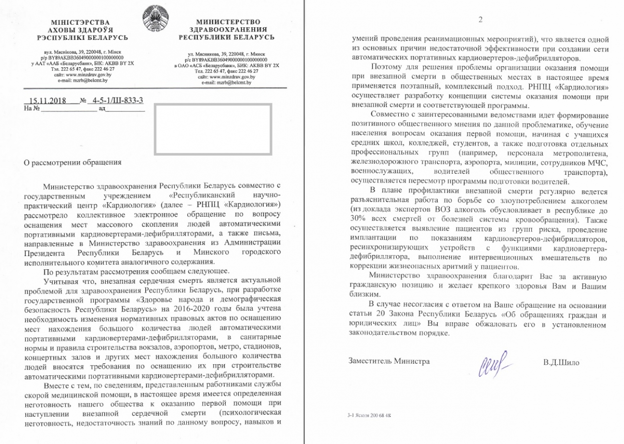 Мы, граждане Республики Беларусь, крайне обеспокоены выживаемостью своих соотечественников при внезапной остановке кровообращения.